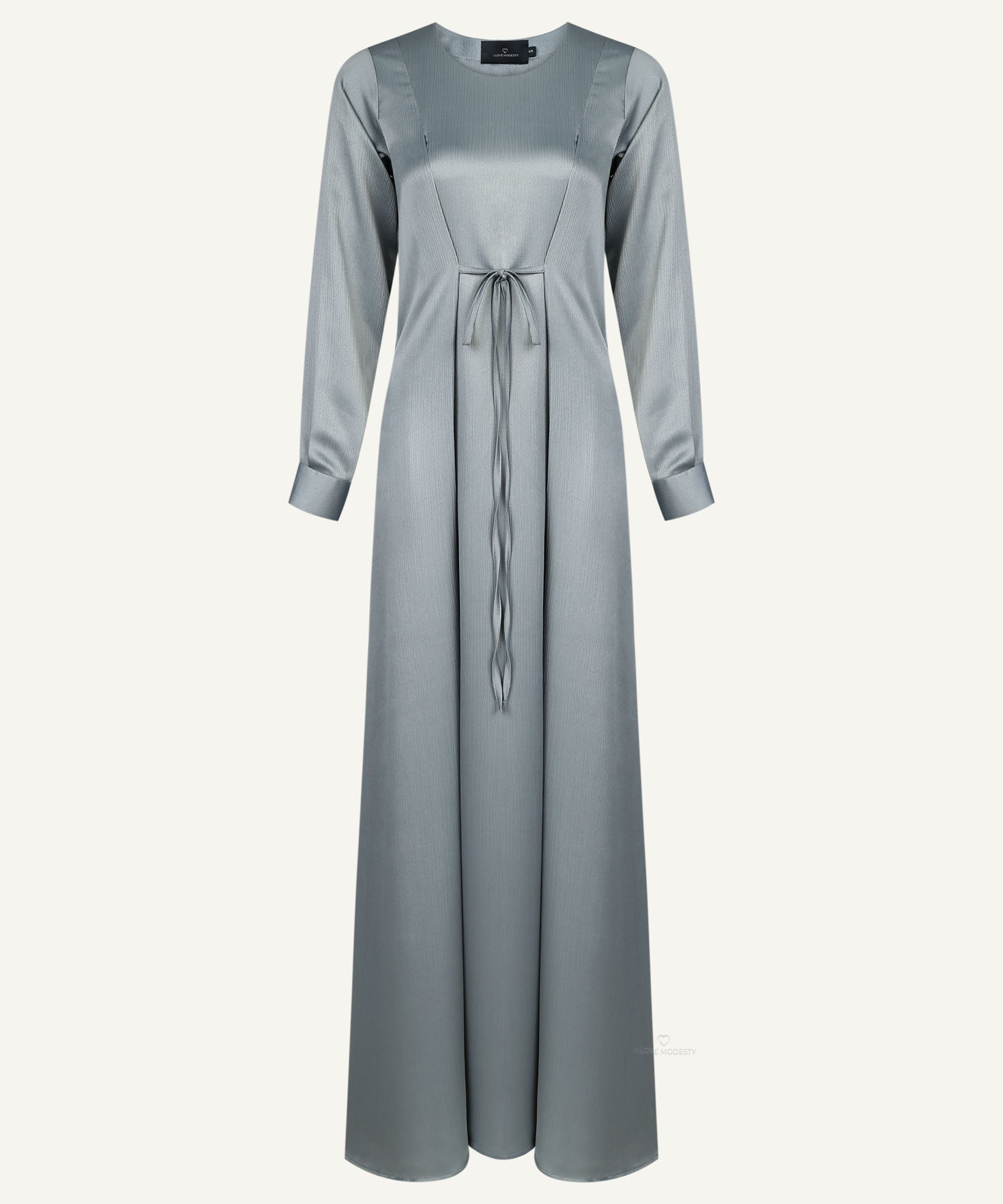 This Ash Blue Front Self-Tie Waist Maxi Dress is crafted from soft georgette fabric and designed with a front self-tie waist closure for a flattering fit. Its A-line silhouette and panel detailing make it ideal for formal dinners, family gatherings, and special occasions.