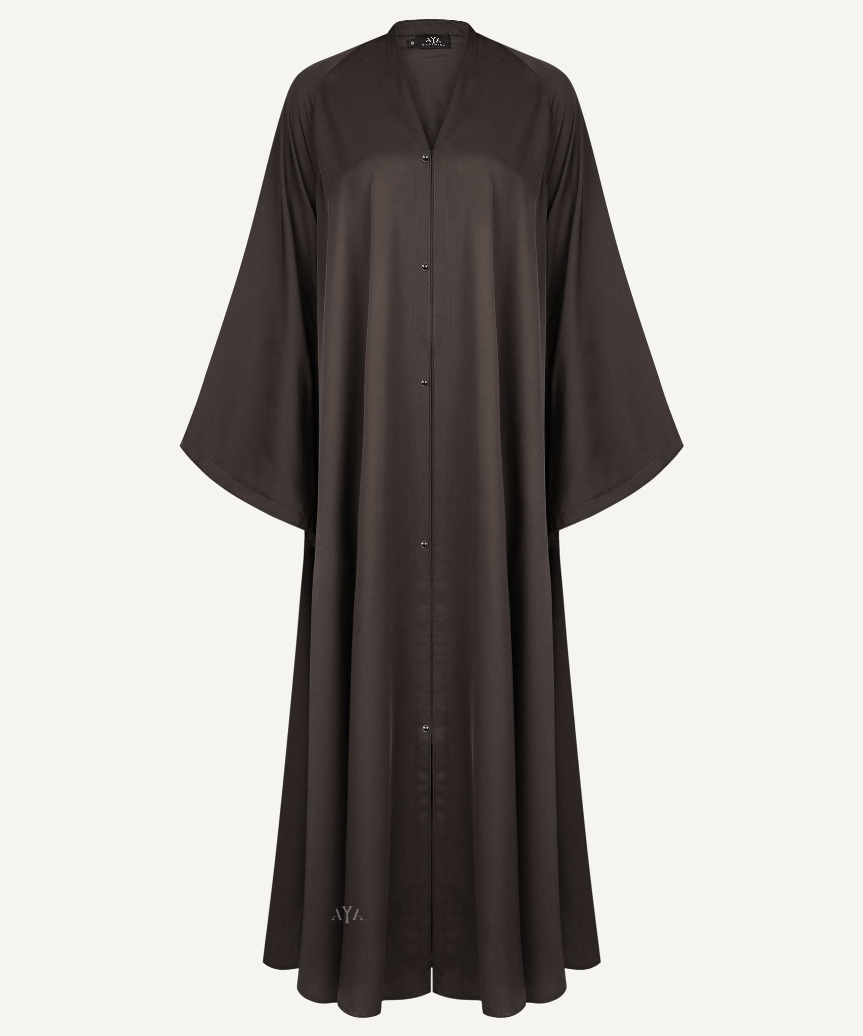 The AYA Cocoa Brown Kimono Sleeve Button-Down Abaya is crafted from a soft, flowy nida fabric, offering both comfort and elegance. Designed with a relaxed A-line silhouette and wide kimono sleeves, it drapes with a graceful look.