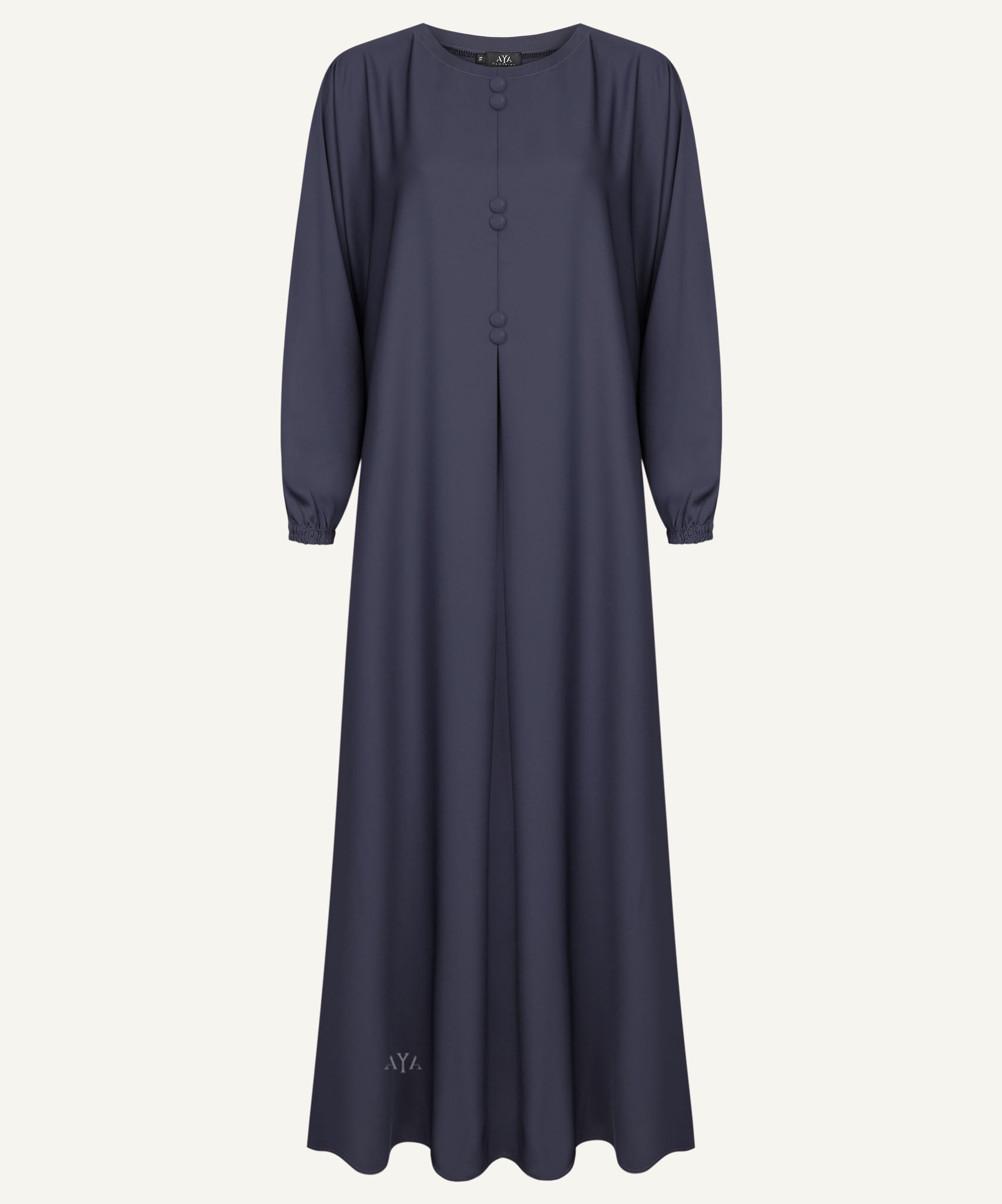 The AYA Deep Navy Pleated Front Button Abaya is crafted from a soft, flowy nida fabric and features a round neckline, front pleat detailing, and fabric-covered buttons. Its relaxed A-line silhouette with elasticated cuff sleeves combines elegance with everyday practicality.