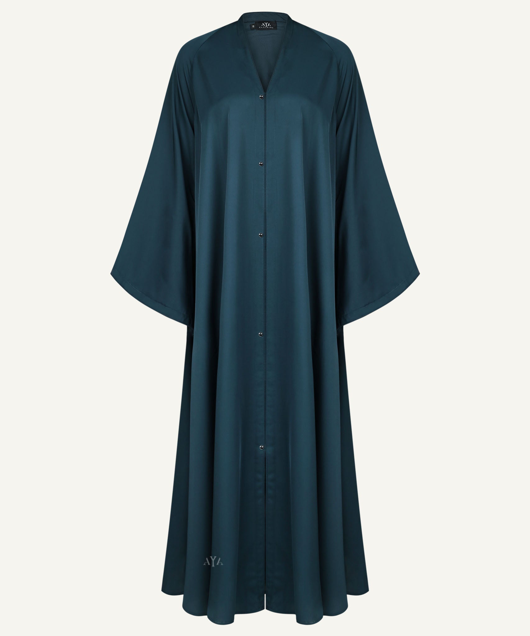 The AYA Deep Teal Kimono Sleeve Button-Down Abaya is crafted from a soft, flowy nida fabric, offering both comfort and elegance. Designed with a relaxed A-line silhouette and wide kimono sleeves, it drapes with a graceful look.