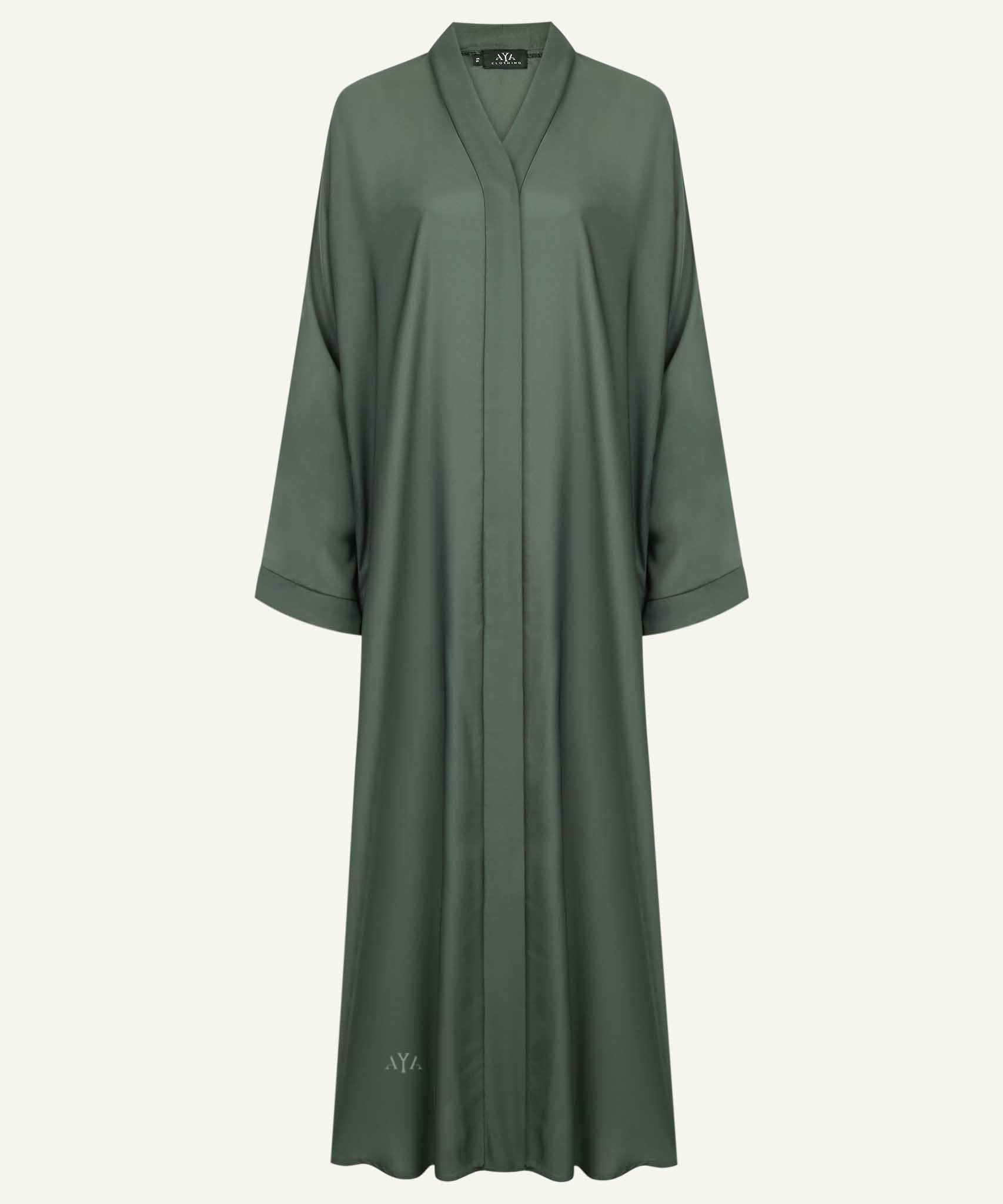 The AYA Ivy Green A-Line Abaya is crafted from a soft, smooth nida fabric. It features a V-neckline with a hidden front button closure and long cuff sleeves. Designed in a classic A-line silhouette, this abaya is perfect for everyday wear.