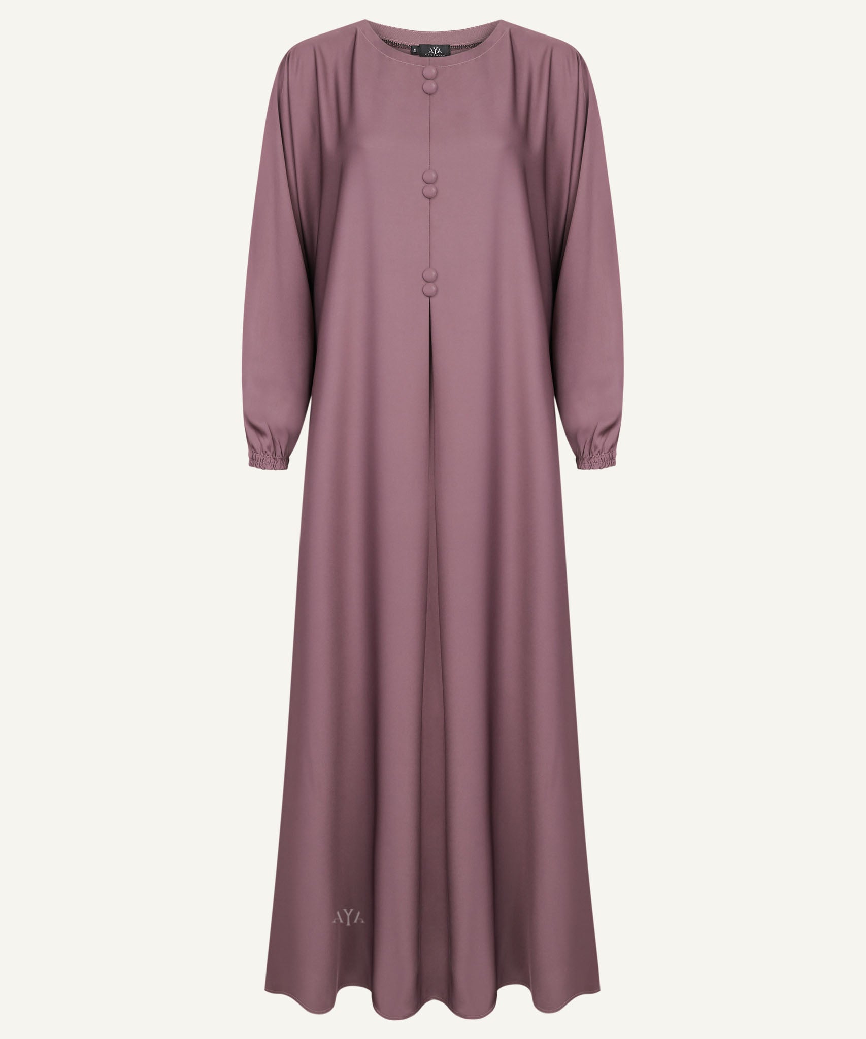 The AYA Mauve Pleated Front Button Abaya is crafted from a soft, flowy nida fabric and features a round neckline, front pleat detailing, and fabric-covered buttons. Its relaxed A-line silhouette with elasticated cuff sleeves combines elegance with everyday practicality.