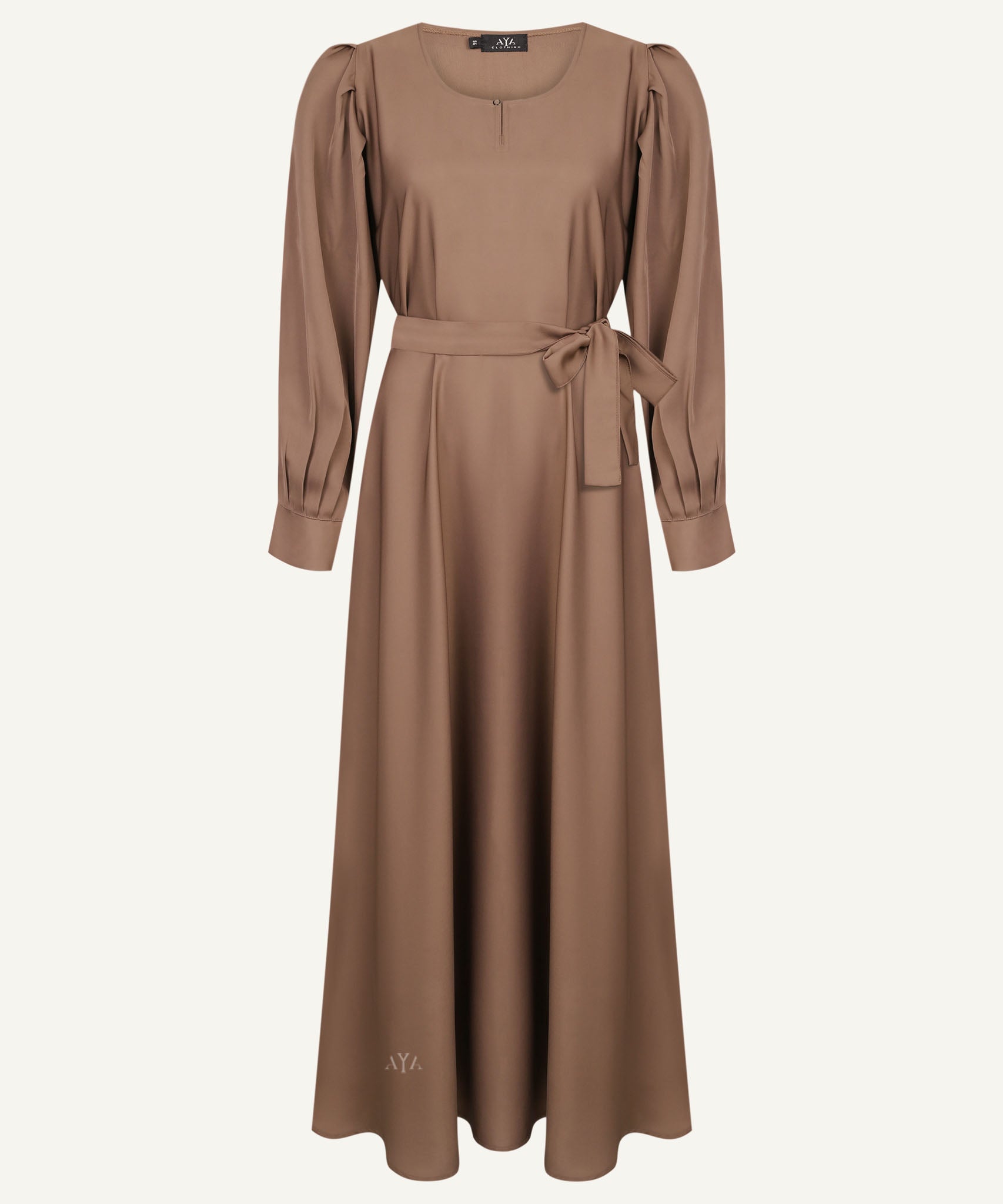 The AYA Mocha Pleated Sleeve Belted Abaya is crafted from a soft, flowy nida fabric. It features a clean round neckline with a subtle button detail and comes with a matching fabric belt that cinches the waist for a flattering fit. Designed in a classic A-line silhouette, this abaya is perfect for everyday wear.