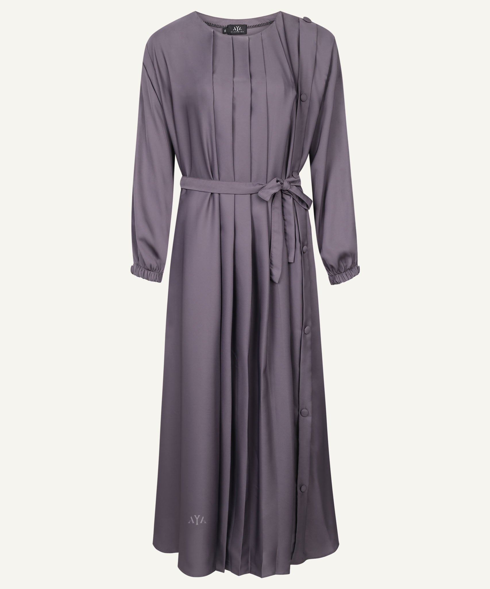 The AYA Smokey Mauve Pleated Neck Abaya is crafted from a soft, flowy nida fabric. It features a pleated detailing along the front, complemented by fabric-covered buttons running down one side for a modern touch. Designed in a classic A-line silhouette, this abaya is perfect for everyday wear.