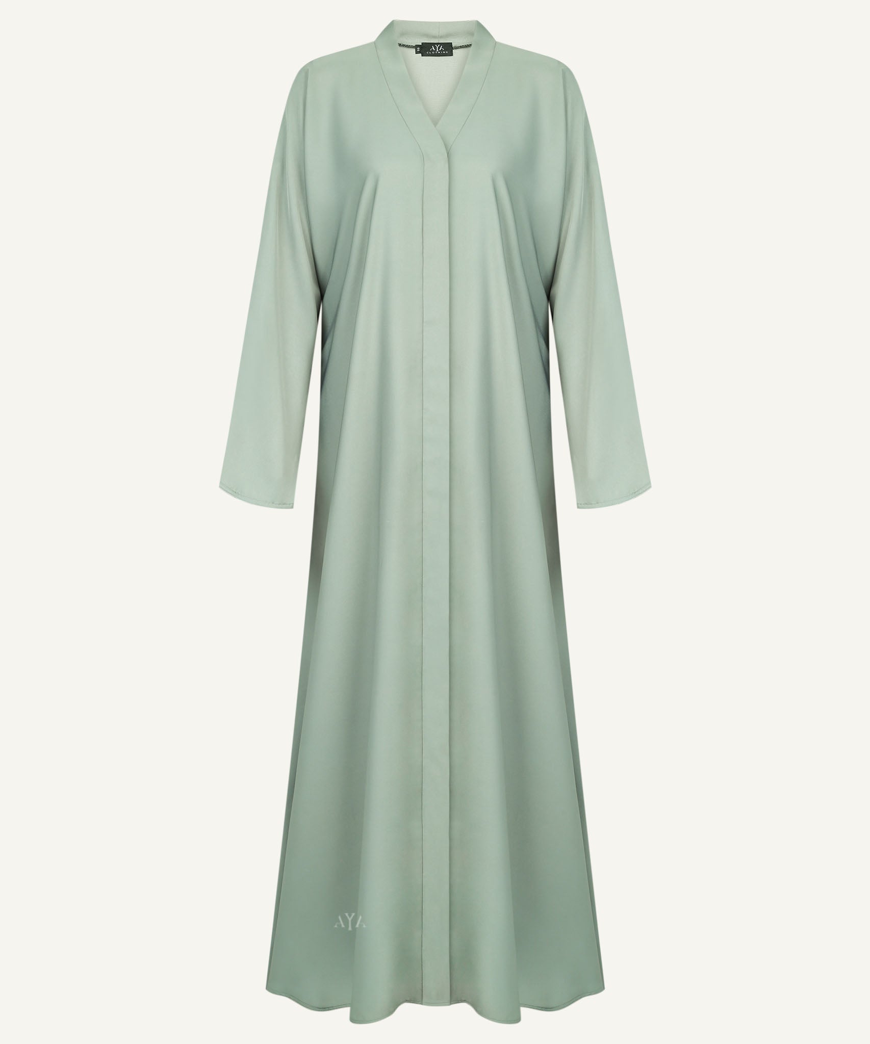 The AYA Sweet Mint Hidden Button-Down Abaya is crafted from a soft, flowy nida fabric and features a clean V-neckline and a hidden button-down front. The relaxed A-line silhouette with long sleeves makes it perfect for everyday wear.