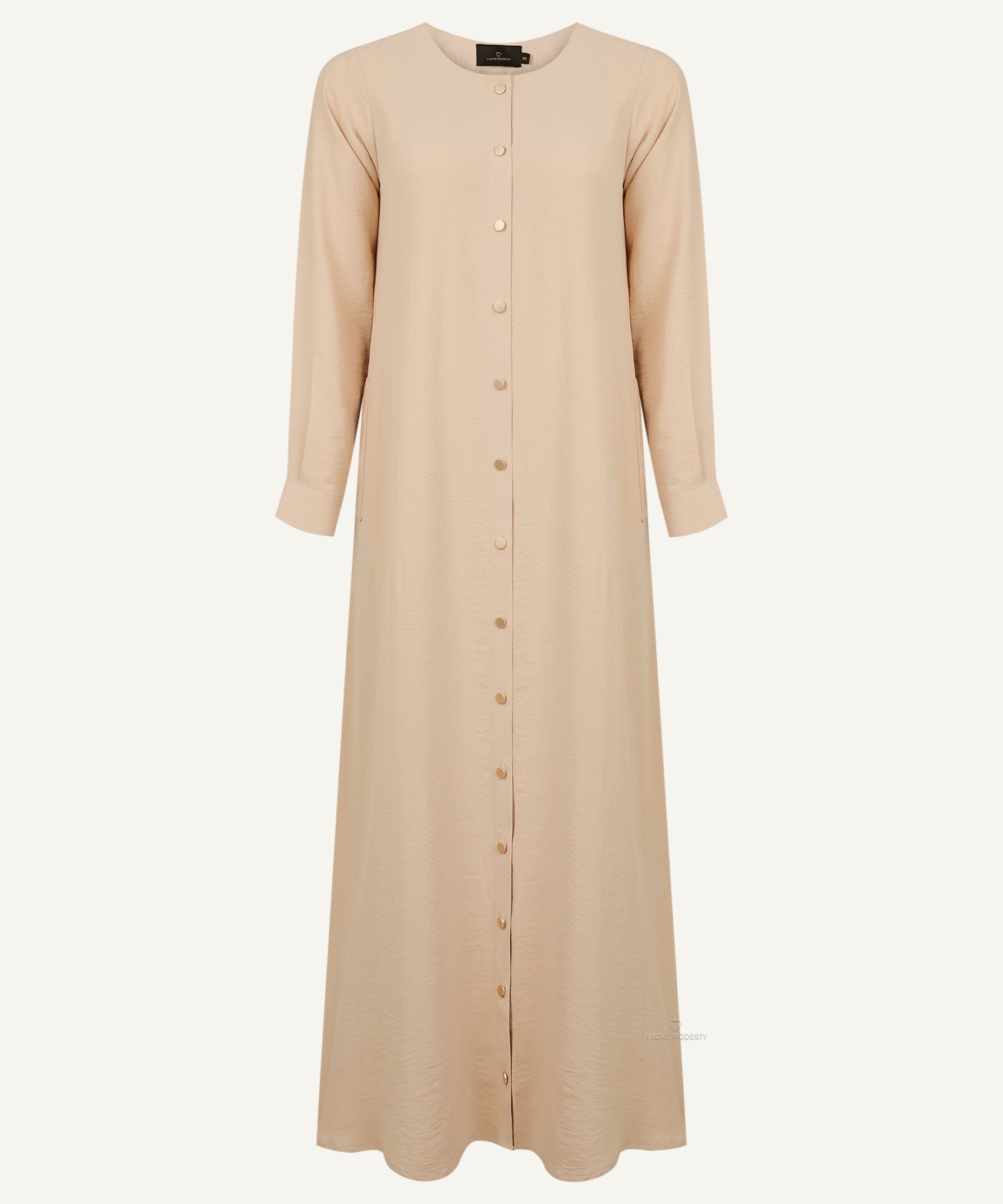 The Beige Button Down A-Line Abaya is crafted from soft, breathable aerobin fabric. It features an A-line cut with a front button-down design, buttoned cuff sleeves, and side pockets.