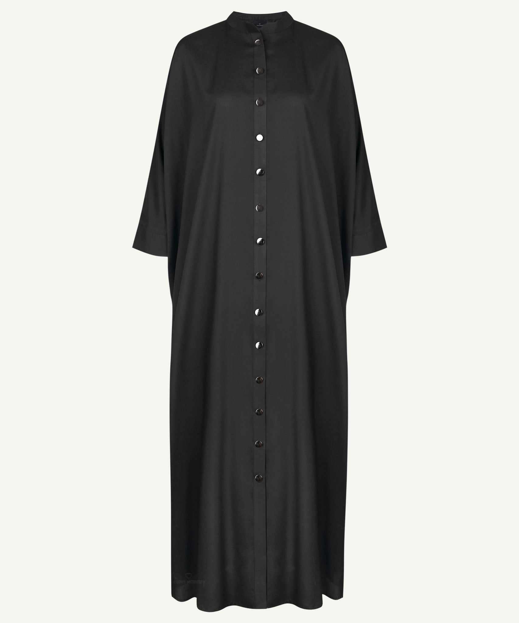 This Black Batwing Button-Down Abaya is crafted from a soft, lightweight viscose blend fabric. It features batwing cut and a loose fit, with front button down detailing, cuff sleeves, and a round neckline.