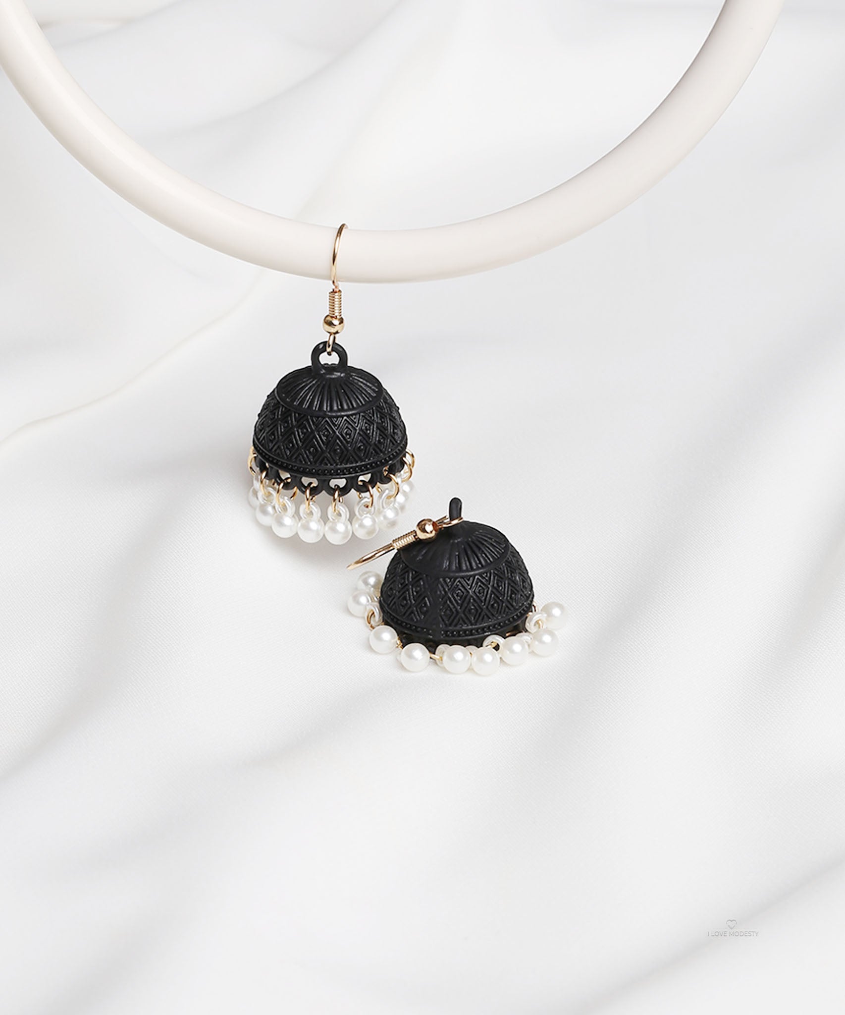 These Black Dome Jhumka Earrings blend tradition with minimalism. Featuring intricate detailing on a dome and delicate pearls, they complement both traditional and modern outfits perfect for weddings, festive occasions, or adding subtle elegance to everyday looks.
