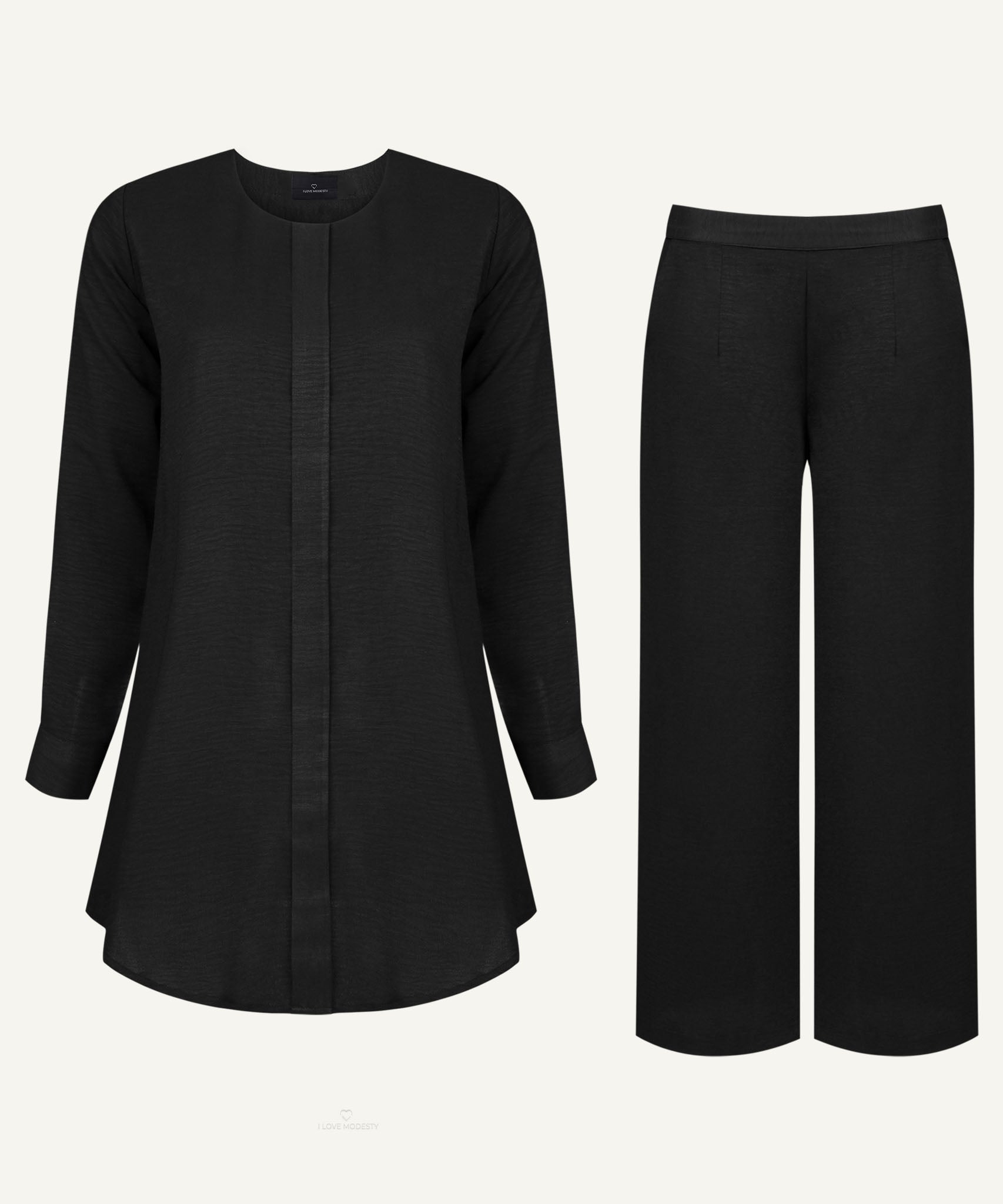 This Black Hidden Placket Top Matching Set is crafted from a soft aerobin fabric. Designed for every day casual wear. The set includes elastic waist trousers for a comfortable fit.