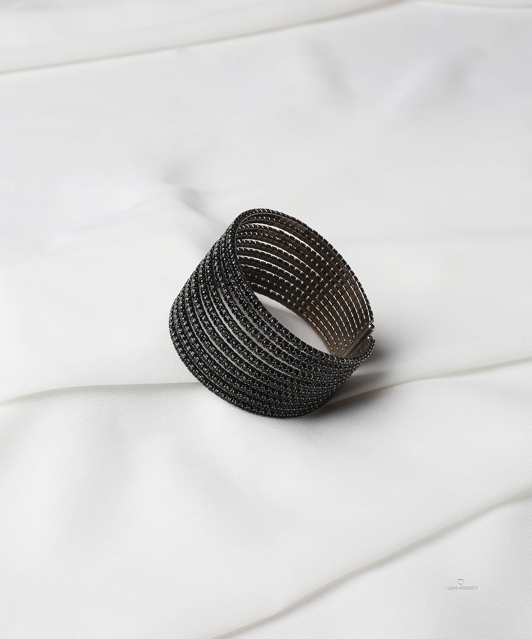This Black Rhinestone Cuff Bracelet features rows of sleek black rhinestones set over a flexible mesh base. Perfect for formal events, or modern festive styling.