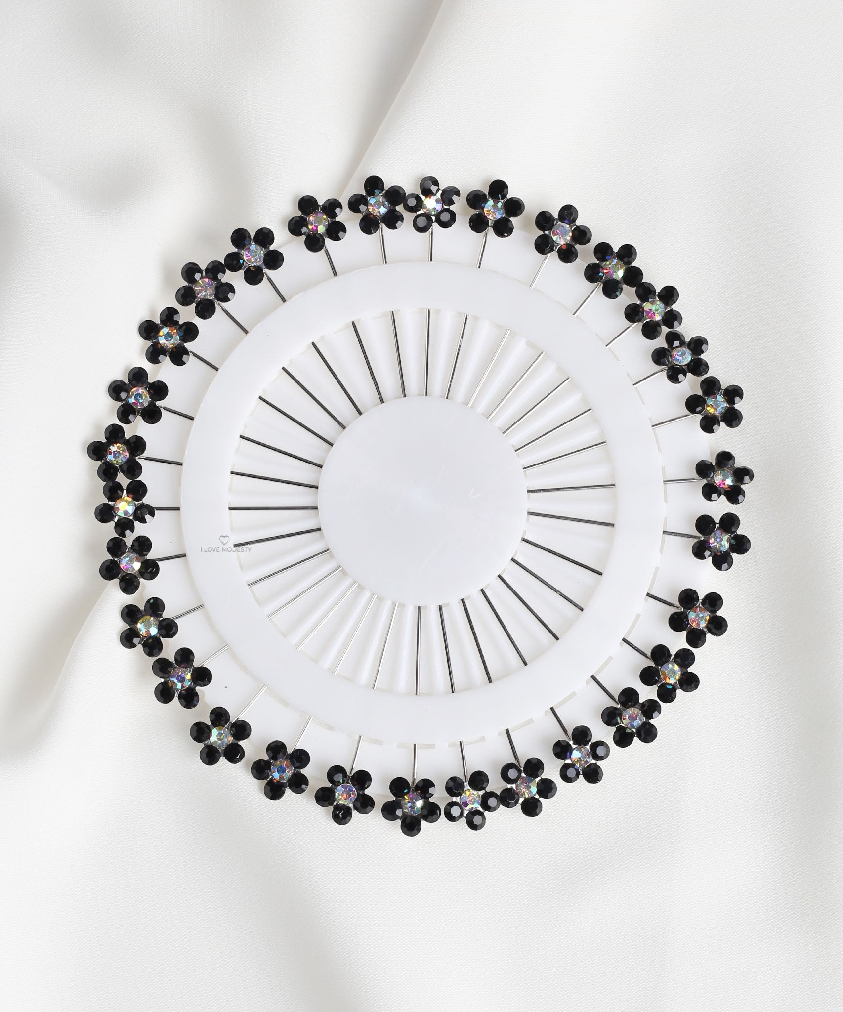 These Black Rhinestone Flower Head Hijab Pins are crafted from steel and come neatly arranged in a compact storage wheel, making them easy to use and store.