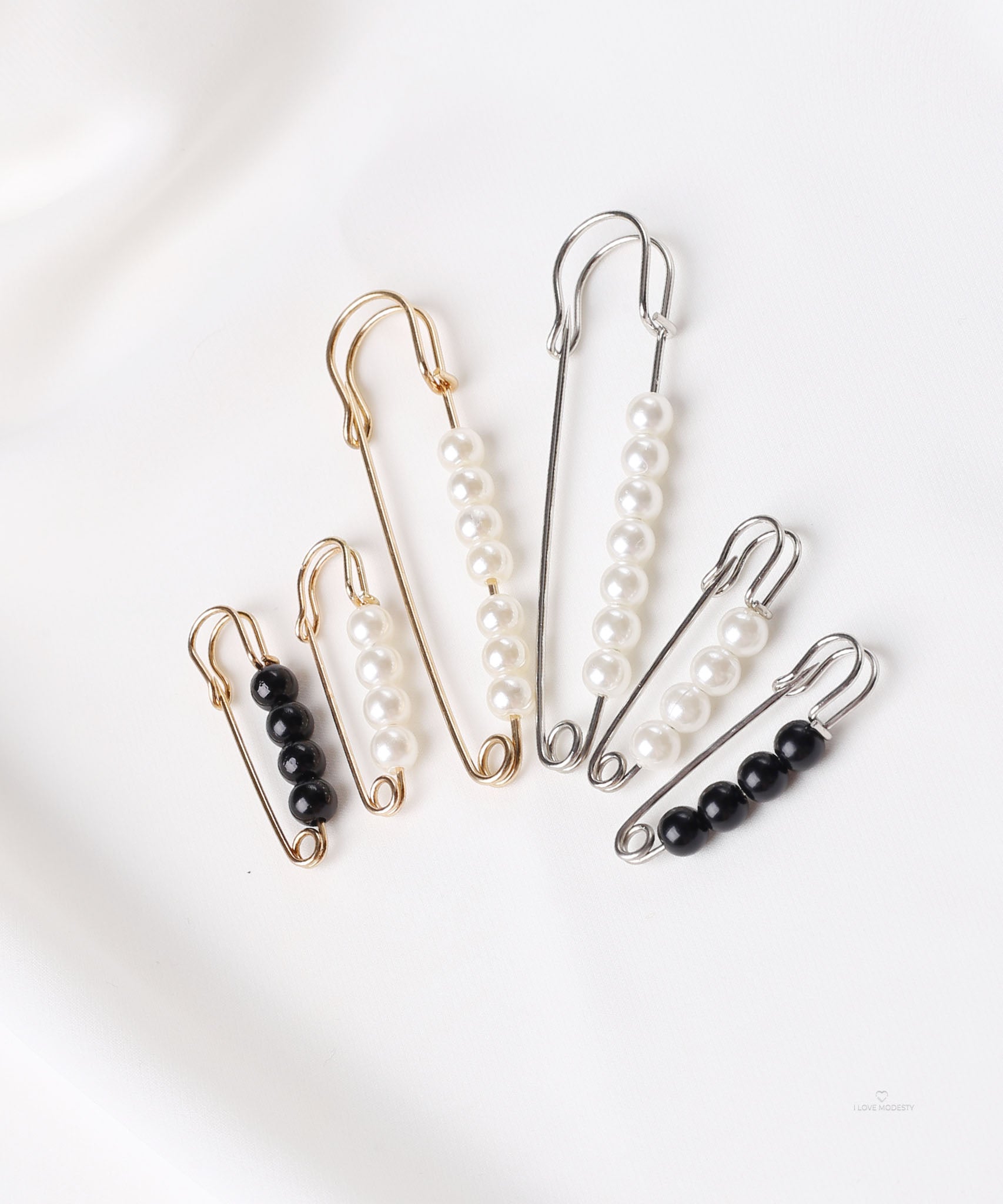 These Black & White Pearl Brooch Pins feature smooth black and white pearls. Their polished finish adds a refined touch to any hijab or outfit, perfect for everyday wear or special occasions.