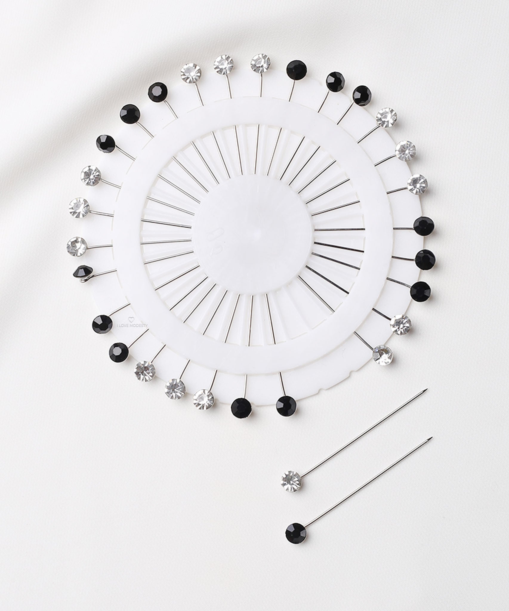 These Black & White Rhinestone Hijab Pins are crafted from steel and come neatly arranged in a compact storage wheel, making them easy to use and store.
