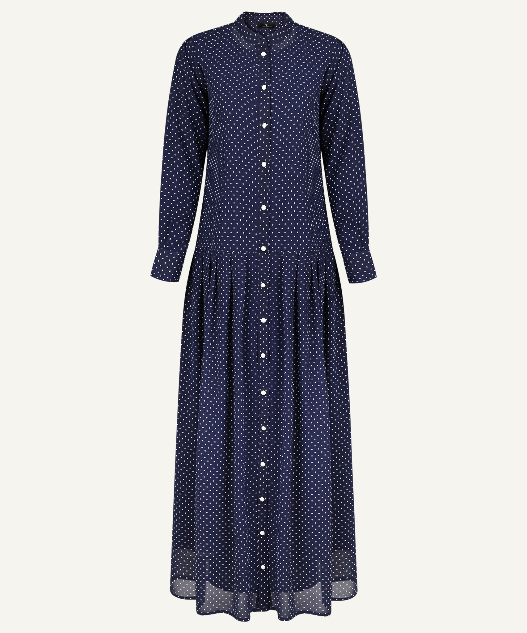 This Blue Polka Dot Button-Down Maxi Dress is crafted from lightweight georgette fabric with an A-line silhouette, featuring soft gathers at the waist and a button-down front. Suitable for casual outings and daytime gatherings in warm weather.