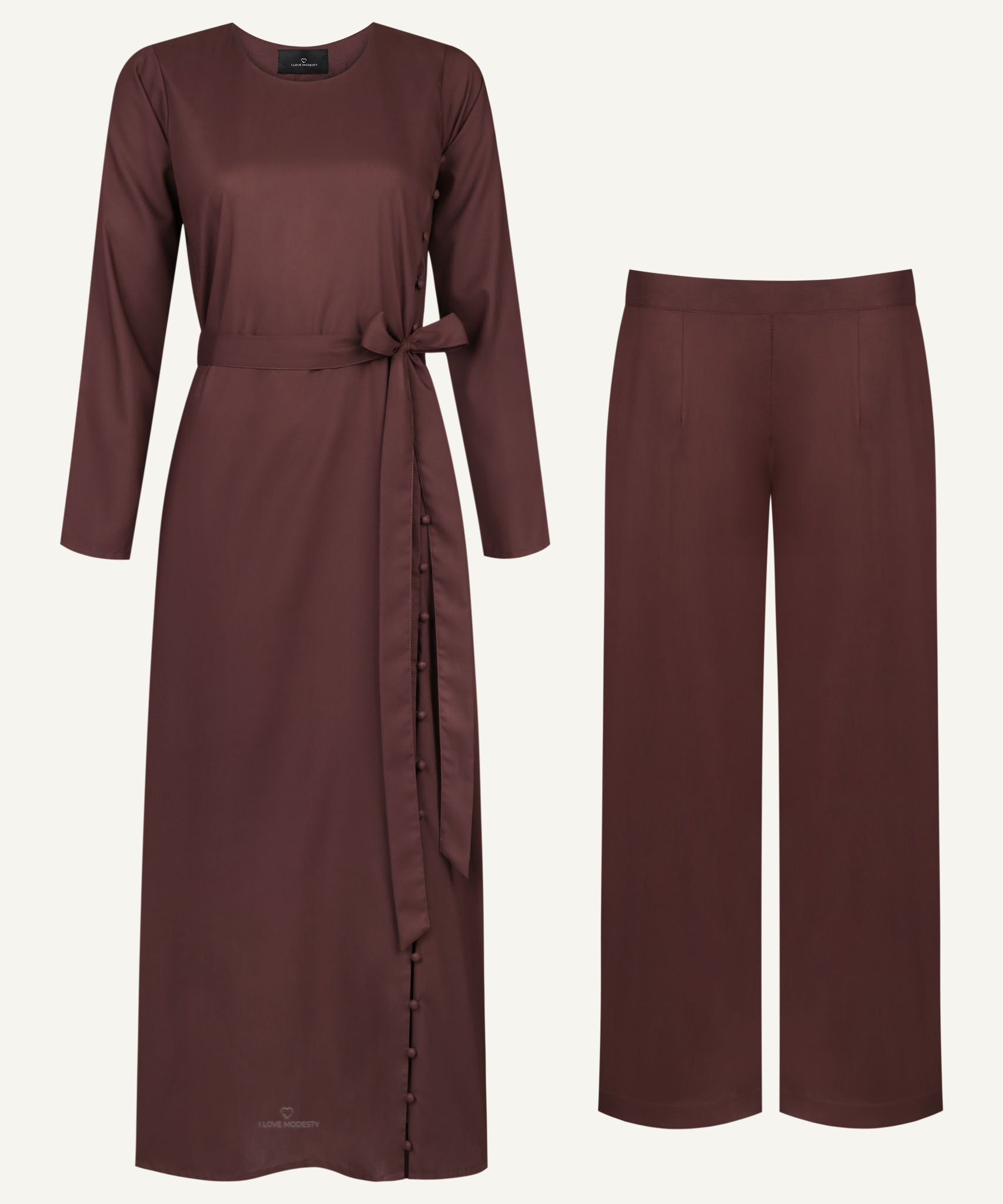 This Brown Side Button-Down Matching Set is crafted from lightweight viscose fabric with a straight silhouette, featuring a side cut across the front with a soft tie detail. Suitable for casual gatherings and day events in mild to warm weather.