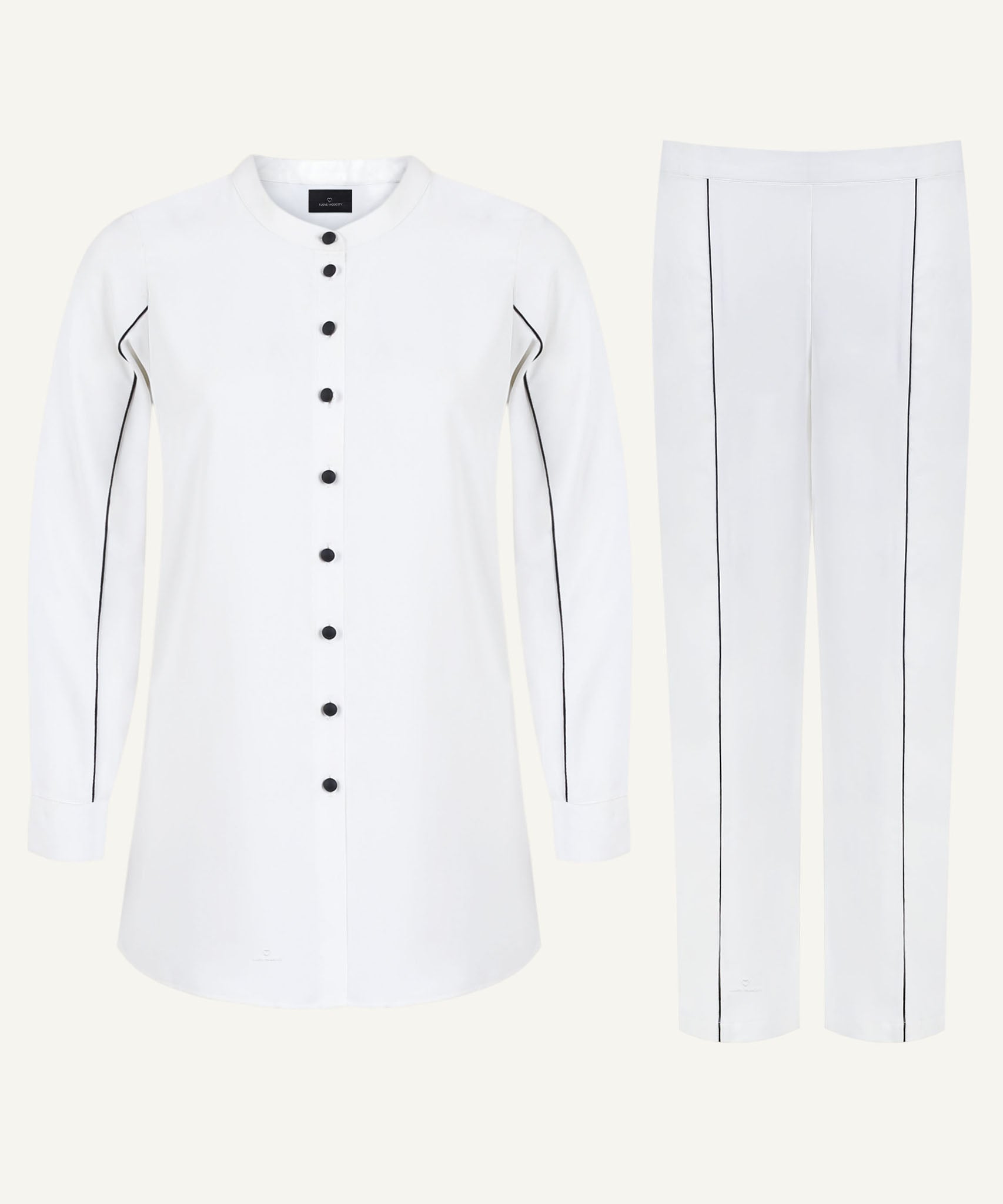 This Coconut White Contrast Piping Button Down Short-Length Matching Set is crafted from lightweight georgette-chiffon fabric. It features a round neckline with a front button-down closure, long sleeves with piping details, and buttoned cuffs. The set includes elastic waist trousers for a comfortable fit.