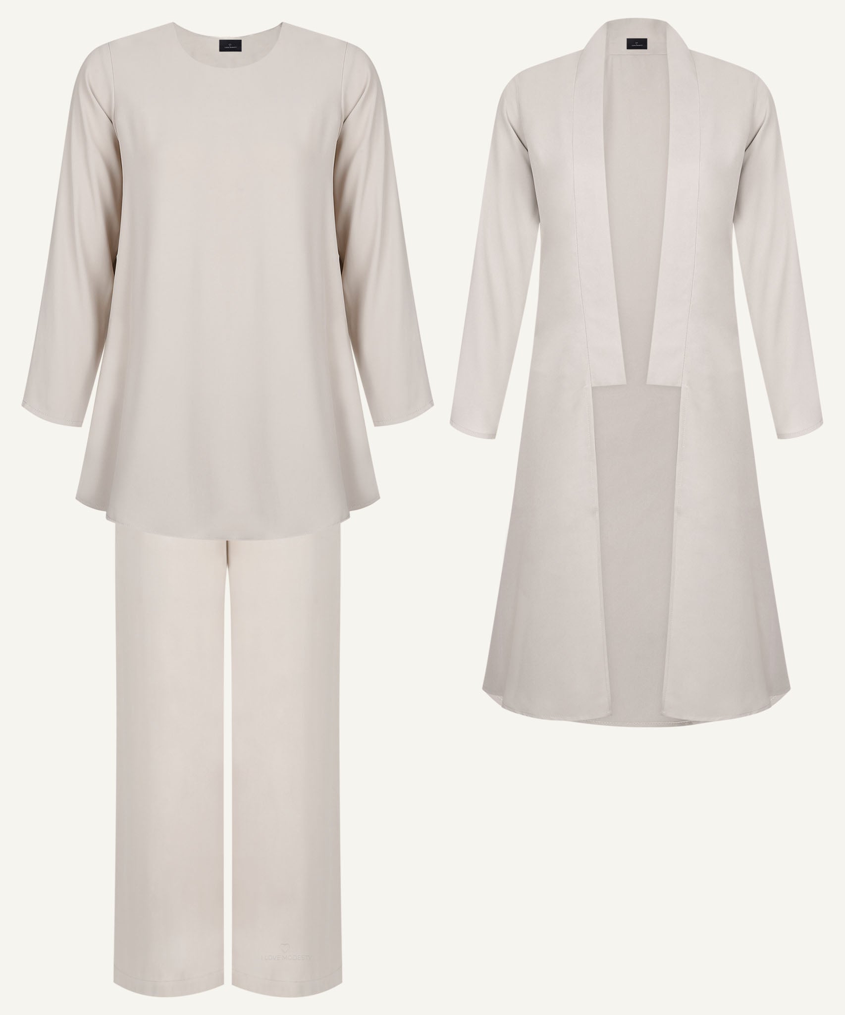 This Creamed Mushroom Cardigan Matching Set, is crafted from lightweight, soft, flowy georgette-chiffon, this set features a straight full-sleeves and a front-open cardigan with a band-style neckline. Ideal for business meetings, office wear, or formal day events.
