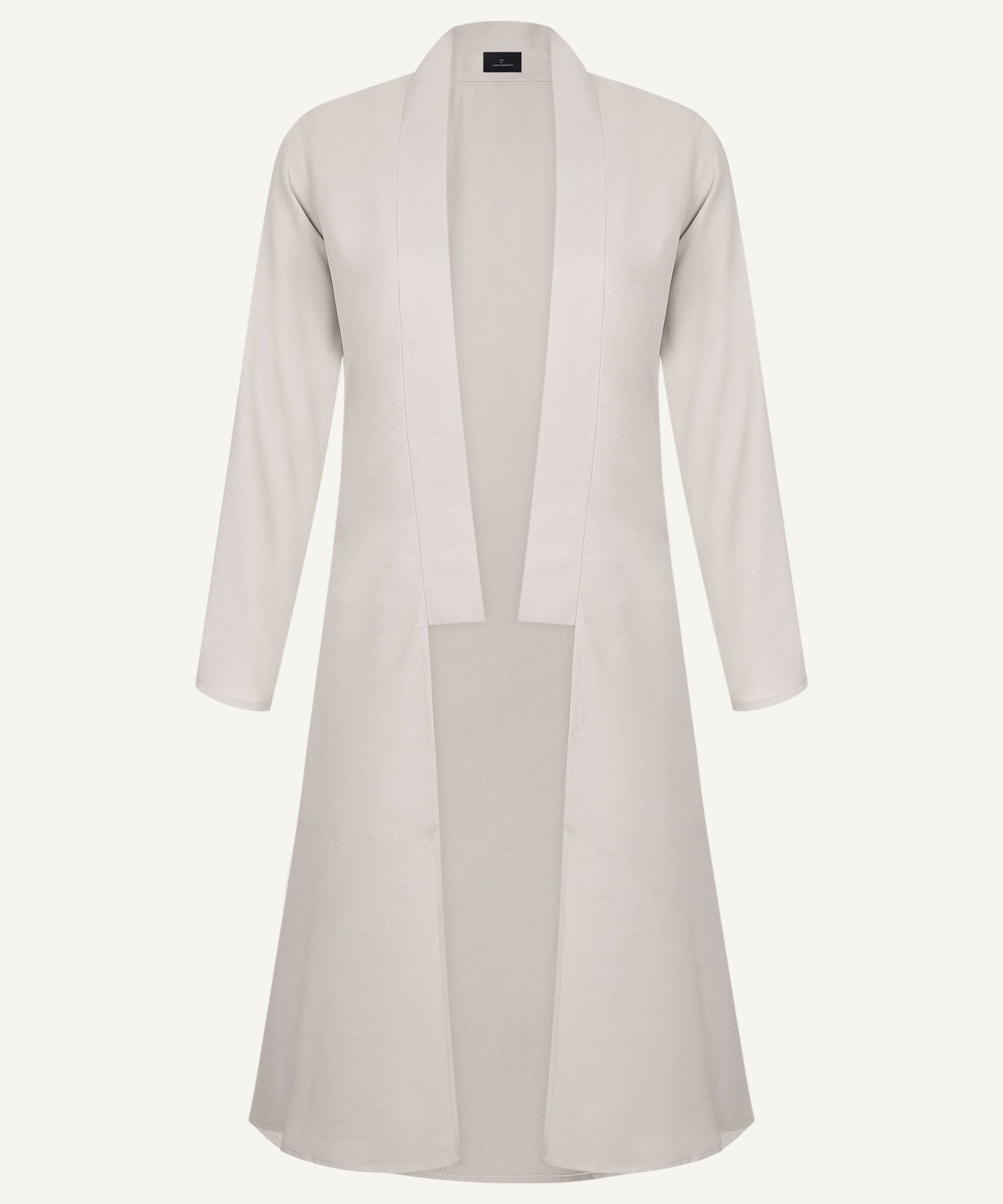 This Creamed Mushroom Full Sleeve Cardigan is crafted from soft, flowy georgette fabric and features a relaxed shawl-style collar. With a length that falls below the knees, it's ideal for layering, making it suitable for workwear and perfect for mild seasons.