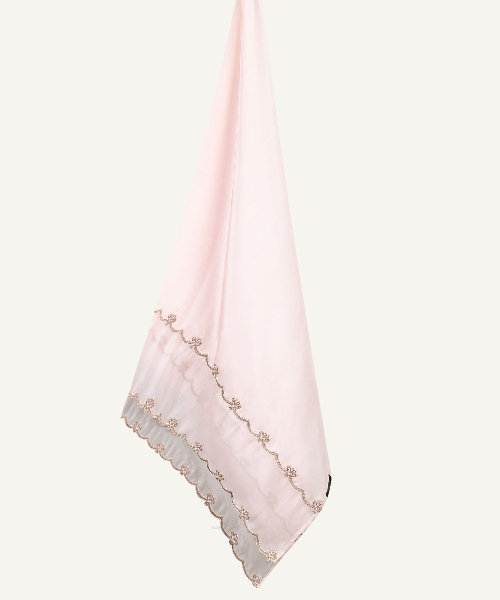The Crystal Pink Embellished Satin Hijab, crafted from soft satin fabric that drapes gracefully with a rich sheen, showcases embroidered borders with handcrafted embellishments, making it perfect for weddings and festive occasions.