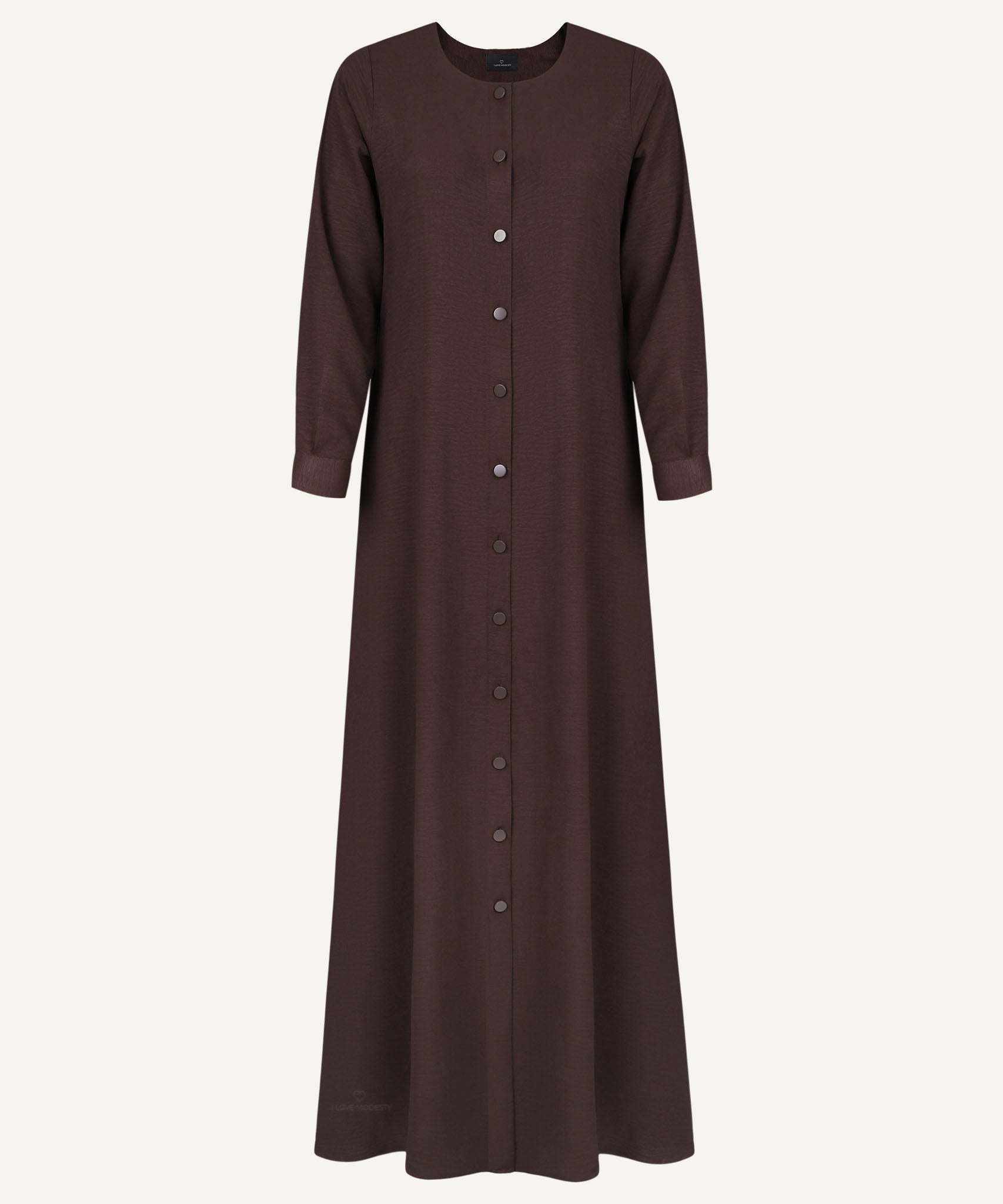 The Dark Brown Button Down Abaya is crafted from soft, breathable aerobin fabric. It features an A-line cut with a front button-down design, buttoned cuff sleeves, and side pockets.
