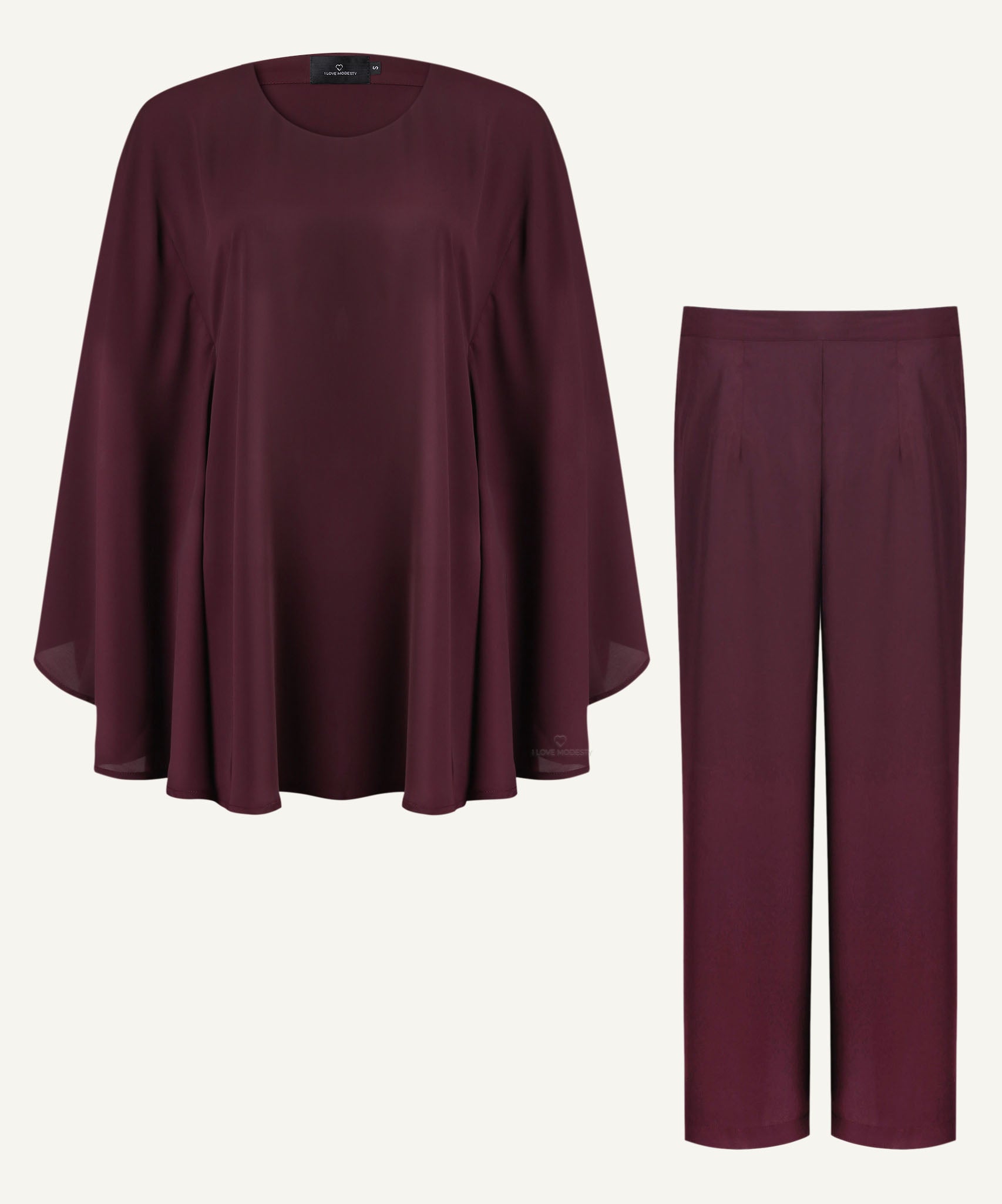 This Dark Maroon Kaftan Tunic Matching Set is crafted from georgette fabric, features short-length flowy batwing-style sleeves. The set includes elastic waist trousers for a comfortable fit. Perfect for cafe meetups, casual hangouts, or effortless daywear.