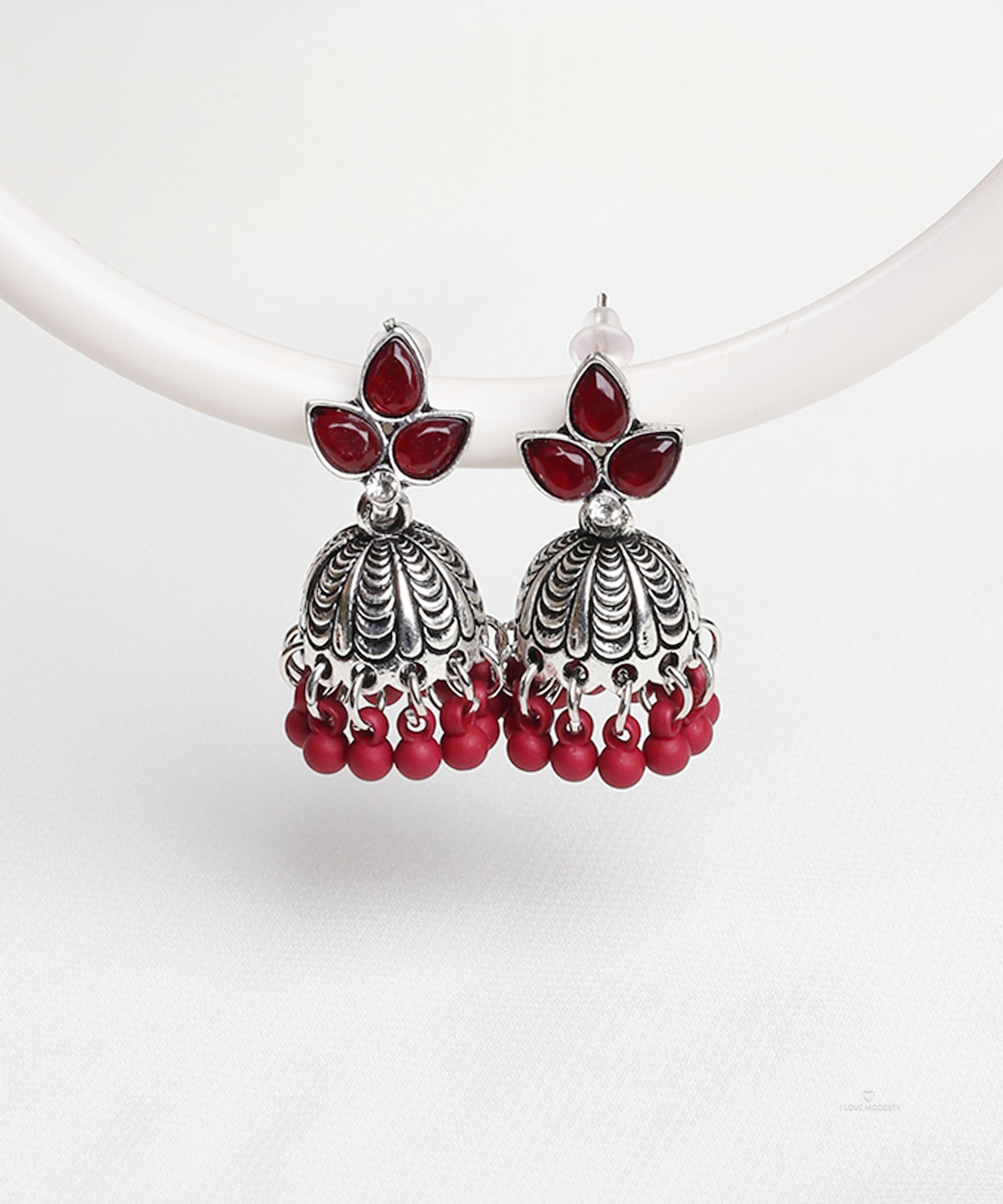 These Dark Red Beads Silver Stud Jhumka Earrings blend tradition with minimalism. Featuring intricate detailing on a dome and delicate beads, they complement both traditional and modern outfits perfect for weddings, festive occasions, or adding subtle elegance to everyday looks.