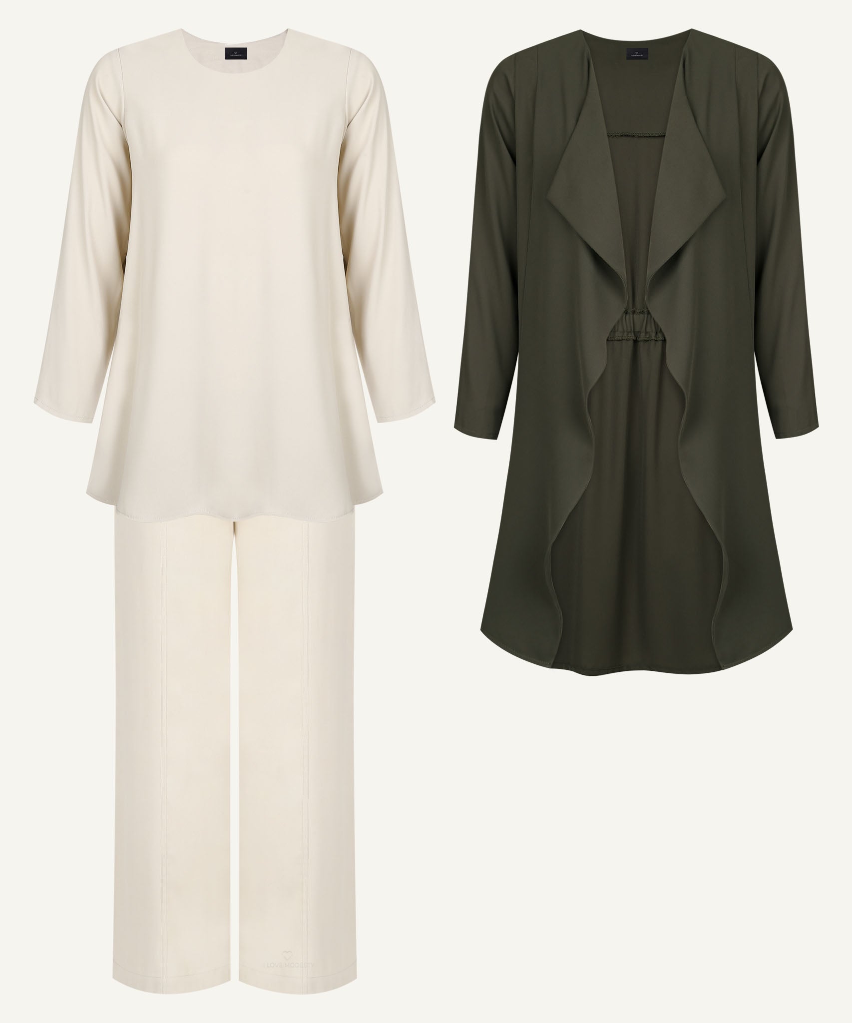 This Dusty Beige Front Open Draped Jacket Matching Set is crafted from soft, flowy georgette. It includes an open-front olive jacket with a shaped waistline for a flattering silhouette. Paired with wide-leg trousers featuring an elastic waistband for ease and comfort. Ideal for office wear, casual outings, or lunch meetups.
