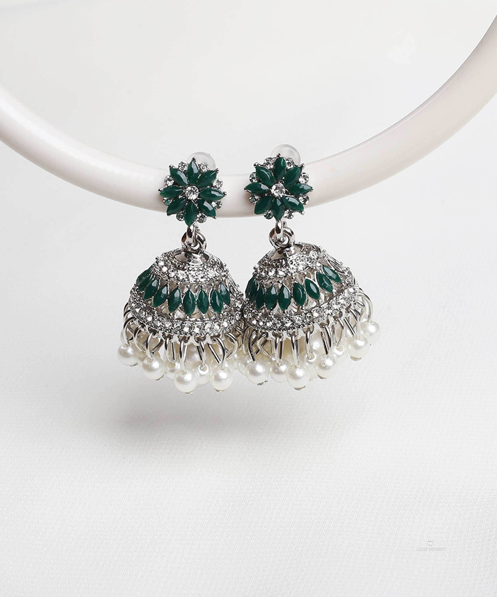 These Emerald Green Stone Silver Stud Jhumka Earrings blend tradition with minimalism. Featuring intricate detailing on a dome and delicate pearls, they complement both traditional and modern outfits perfect for weddings, festive occasions, or adding subtle elegance to everyday looks.