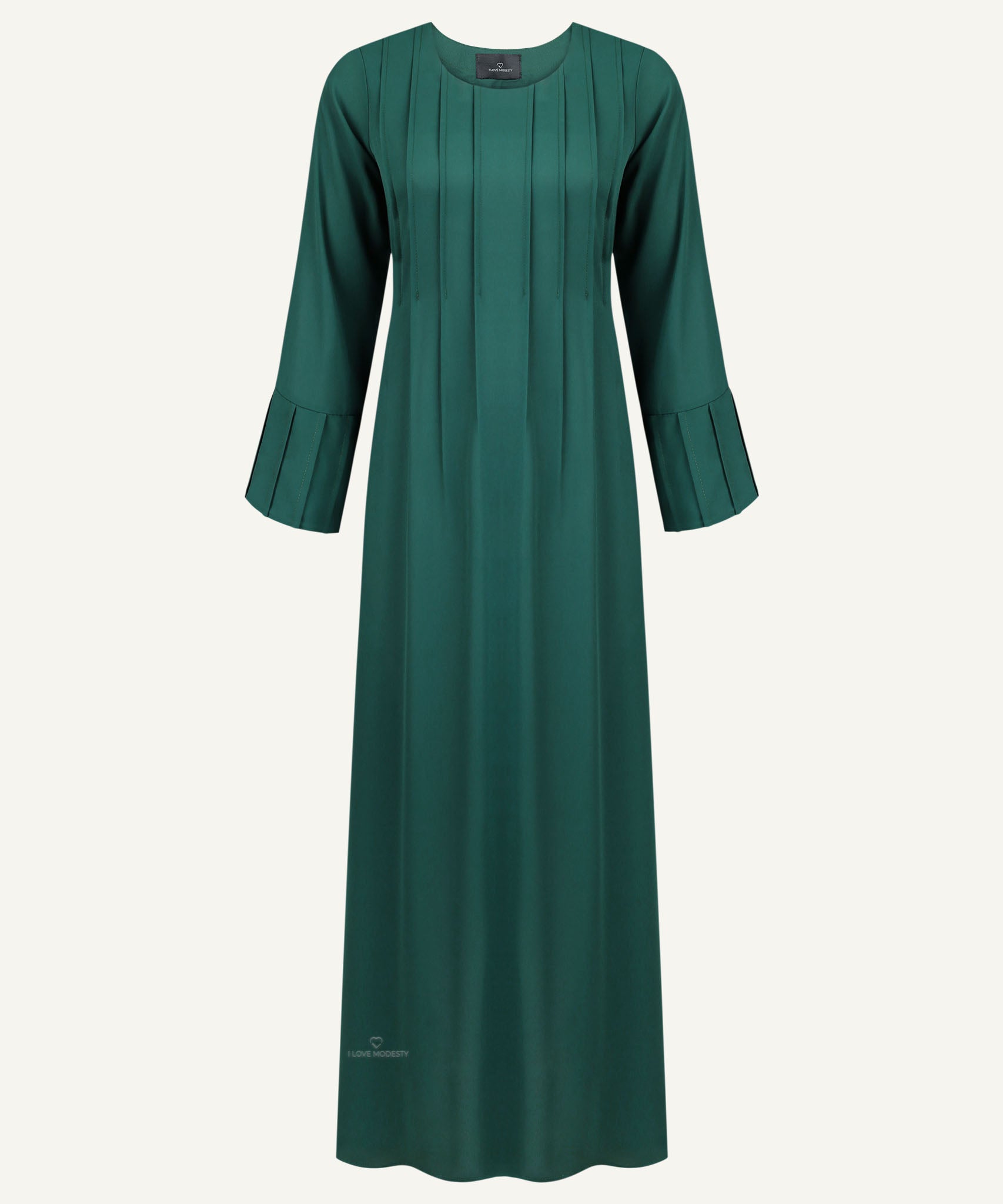 The Forest Green Front Pleated Abaya is crafted from soft georgette fabric. It features an A-line cut with vertical pleats detailing starting from the chest downwards. The full sleeves are finished with wide cuffs, detailed with pleats that complement the front design.