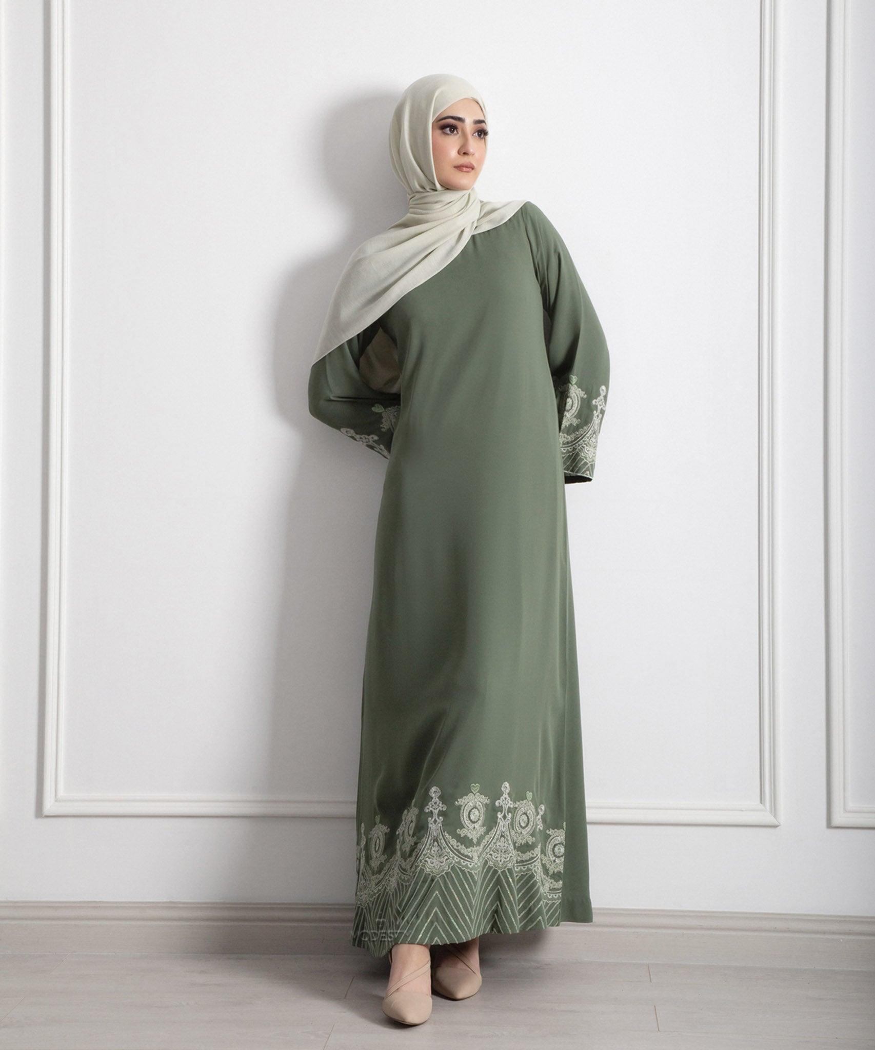 The Embroidered Matte Green A-line Dress features intricate embroidery with sequins and a flattering silhouette. The net dupatta, with a four-side border, adds a refined touch, making it perfect for any occasion.