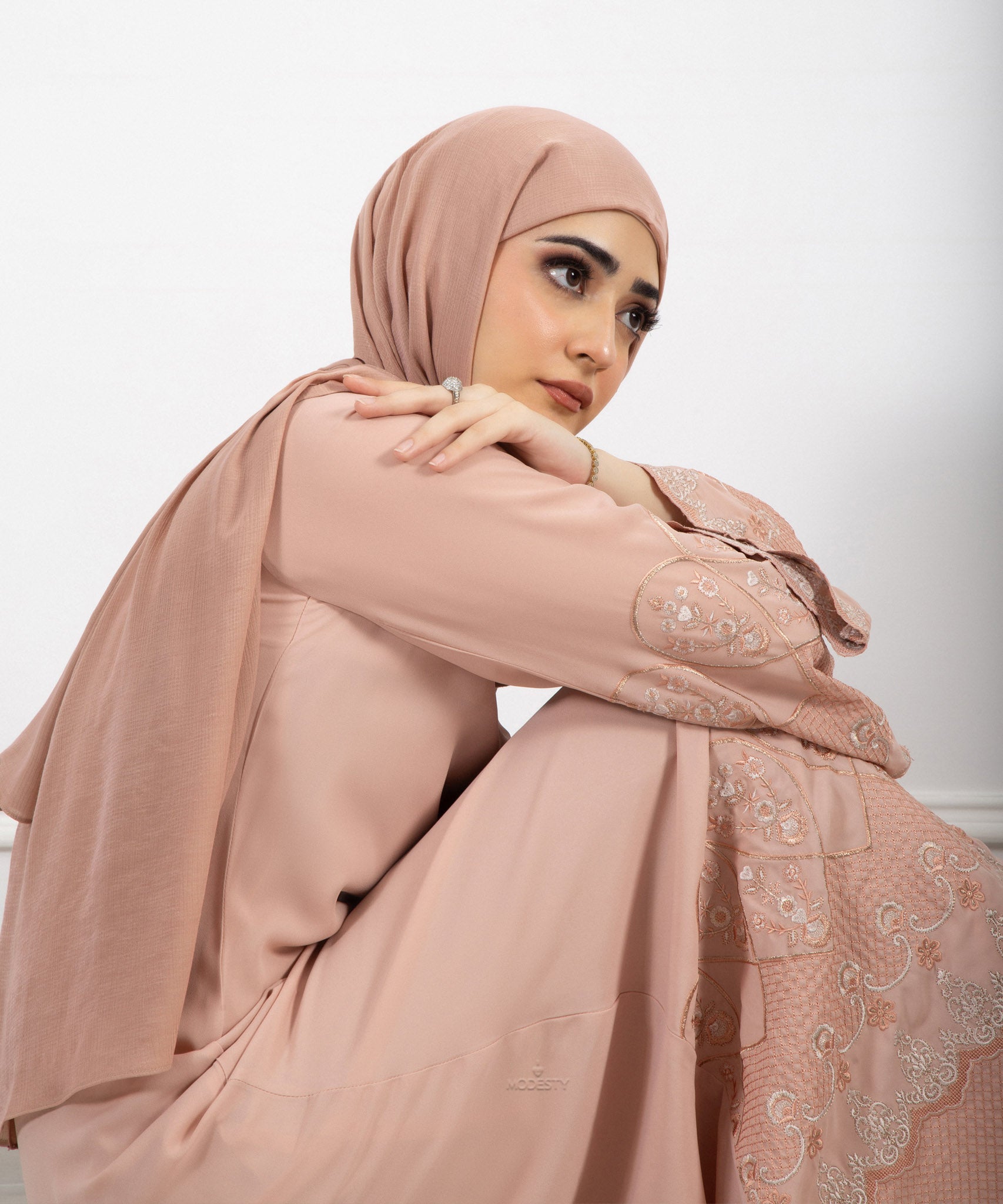 The Embroidered Heart Sand Strom A-line Dress features intricate embroidery with sequins and a flattering silhouette. The net dupatta, with a four-side border, adds a refined touch, making it perfect for any occasion.