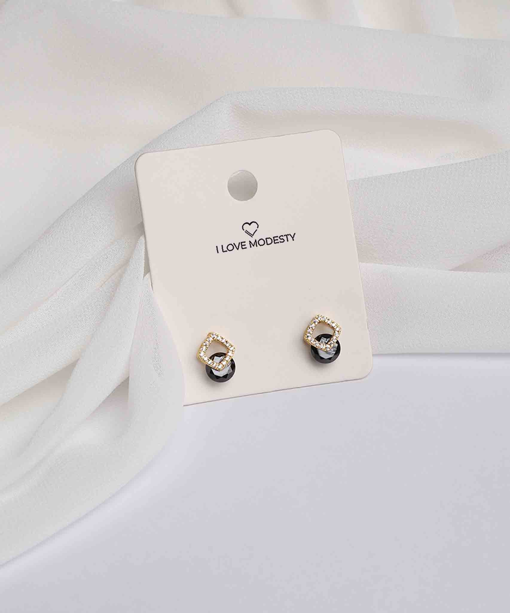 These Gold Black Stone Stud Earrings feature a high-shine gold square frame delicately encrusted with fine crystals, encasing a glossy black stone. Ideal for both casual wear and evening looks.
