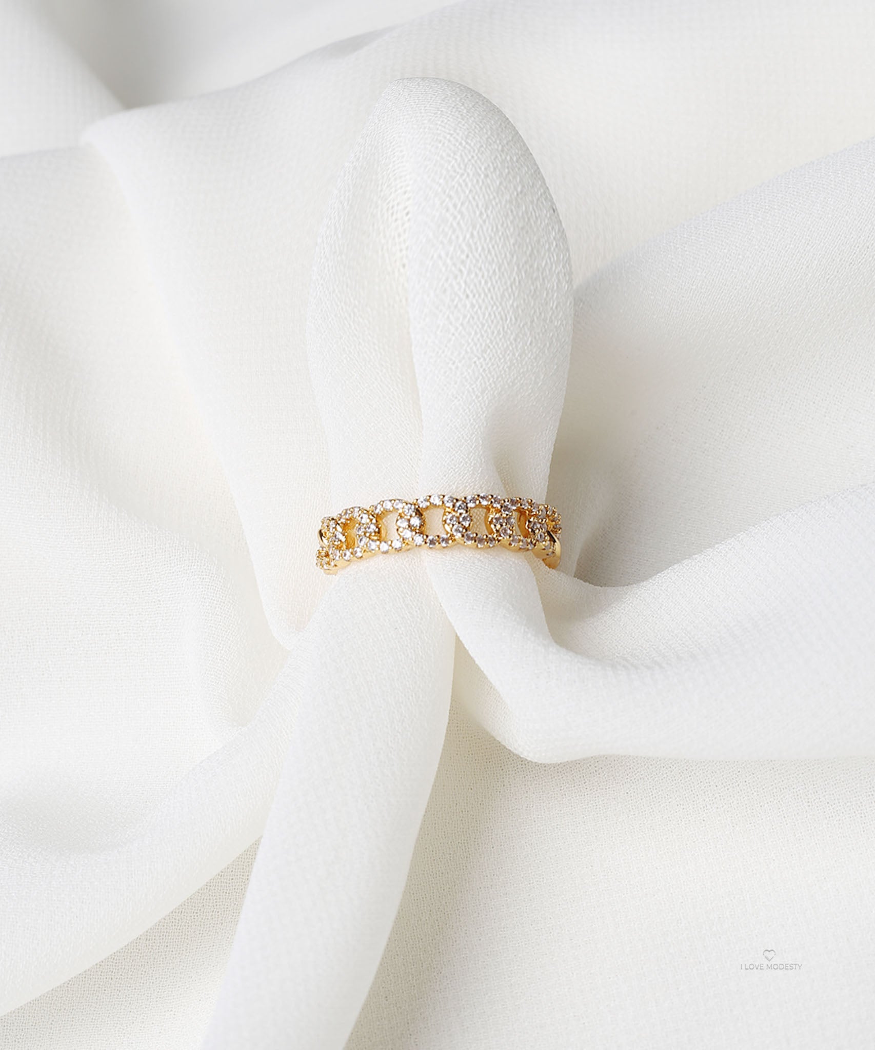 This Gold Chain Link Ring designed with interlocking chain links, each encrusted with sparkling stones. Its bold yet elegant design makes it perfect for both everyday and evening looks.