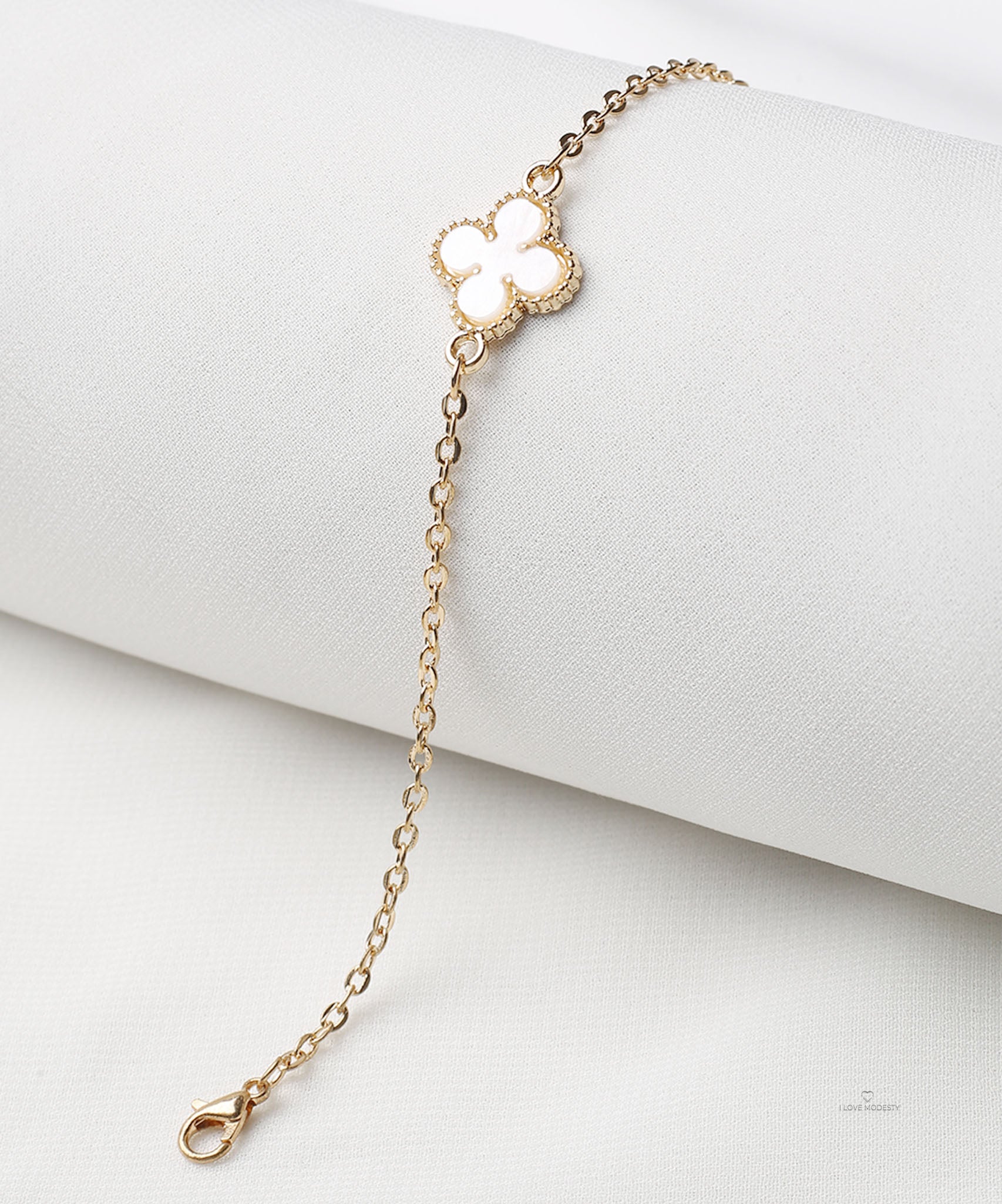 This Gold Clover Link Bracelet features a delicate chain centered with a four-petal clover motif inlaid with a soft white enamel finish, framed with fine beaded design detailing. Lightweight and adjustable, it’s perfect for everyday wear.