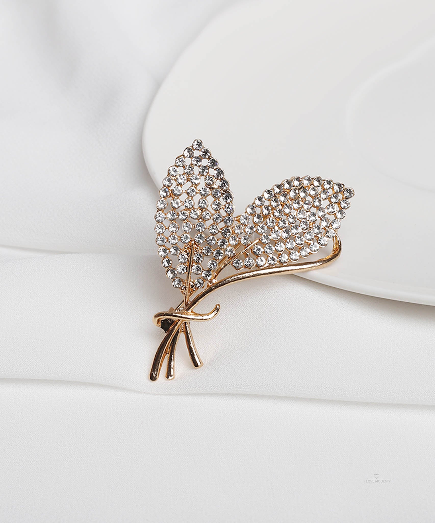 This Gold Dual Leaf Crystal Brooch Pin featuring a gold base adorned with shimmering crystals. Its intertwined leaf design brings a graceful, polished finish to your outfit or hijab, perfect for elegant and festive styling.