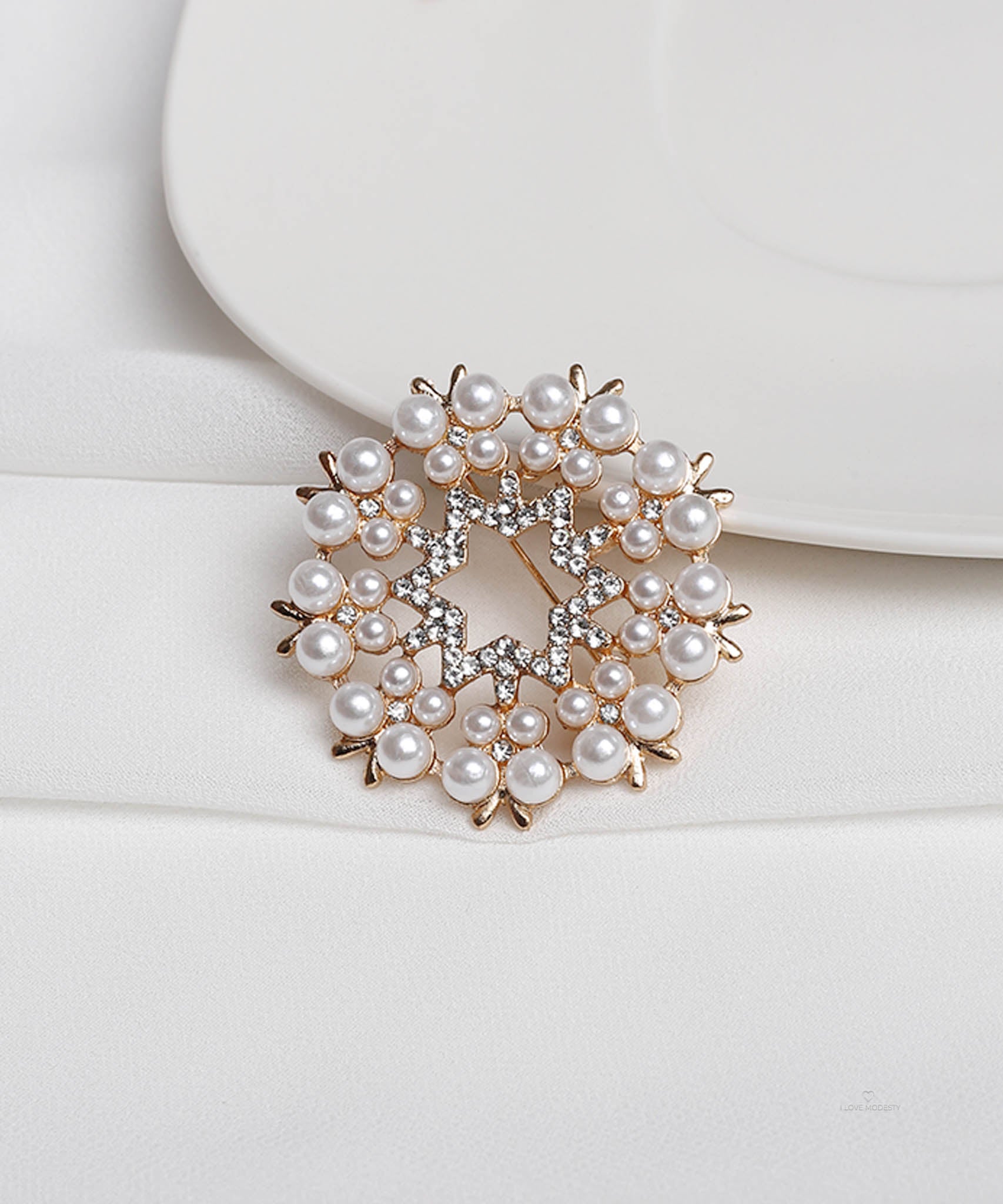 This Gold Starburst Pearl Brooch Pin featuring a gold-tone circular frame adorned with luminous pearls and a central star-shaped crystal cluster. Its intricate design adds a touch of grace and sophistication to both formal and festive looks.