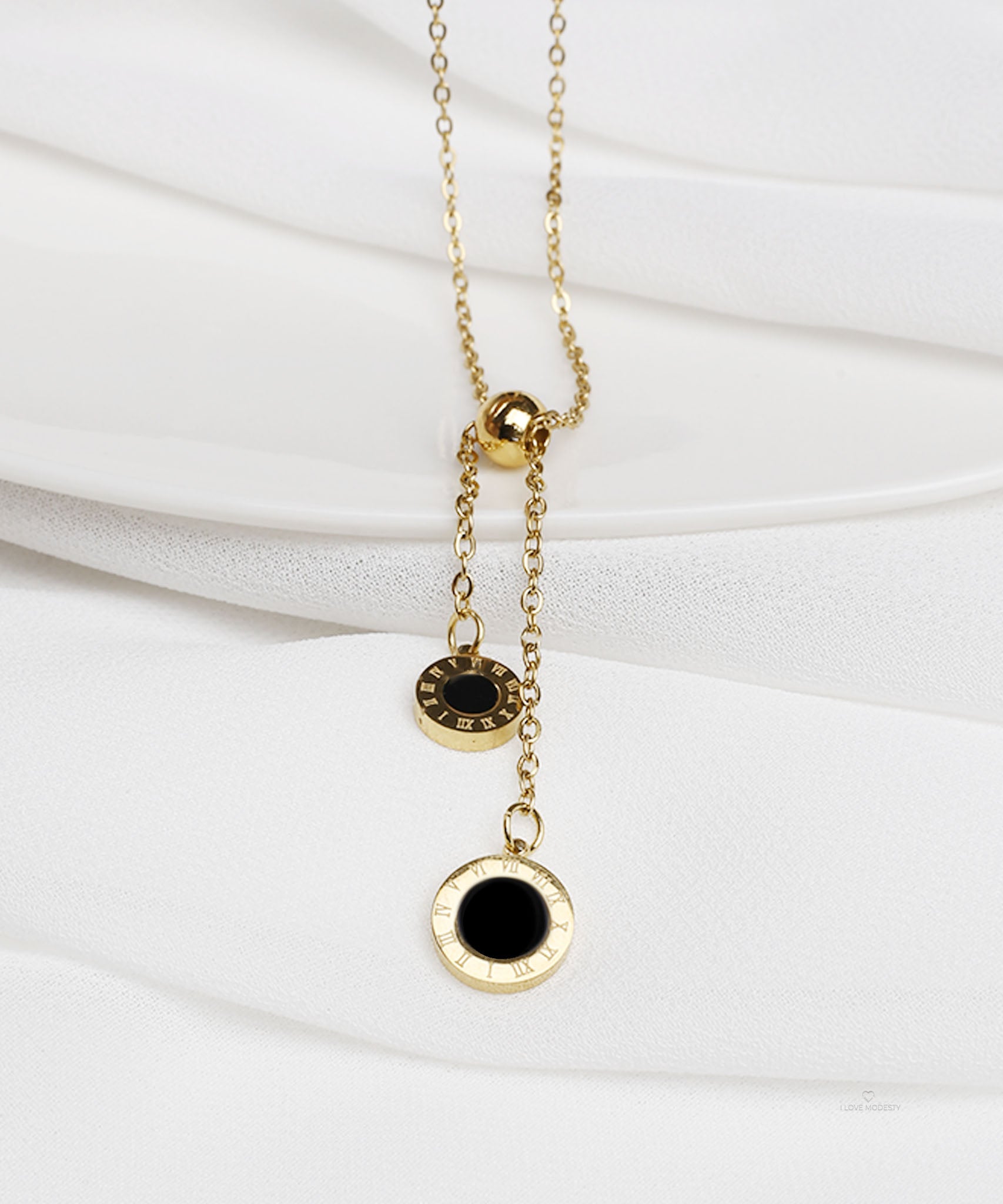 This Gold with Black Coin Necklace features two black enamel coin pendants. Perfect for everyday styling or a subtle statement at dinners and semi-formal gatherings.