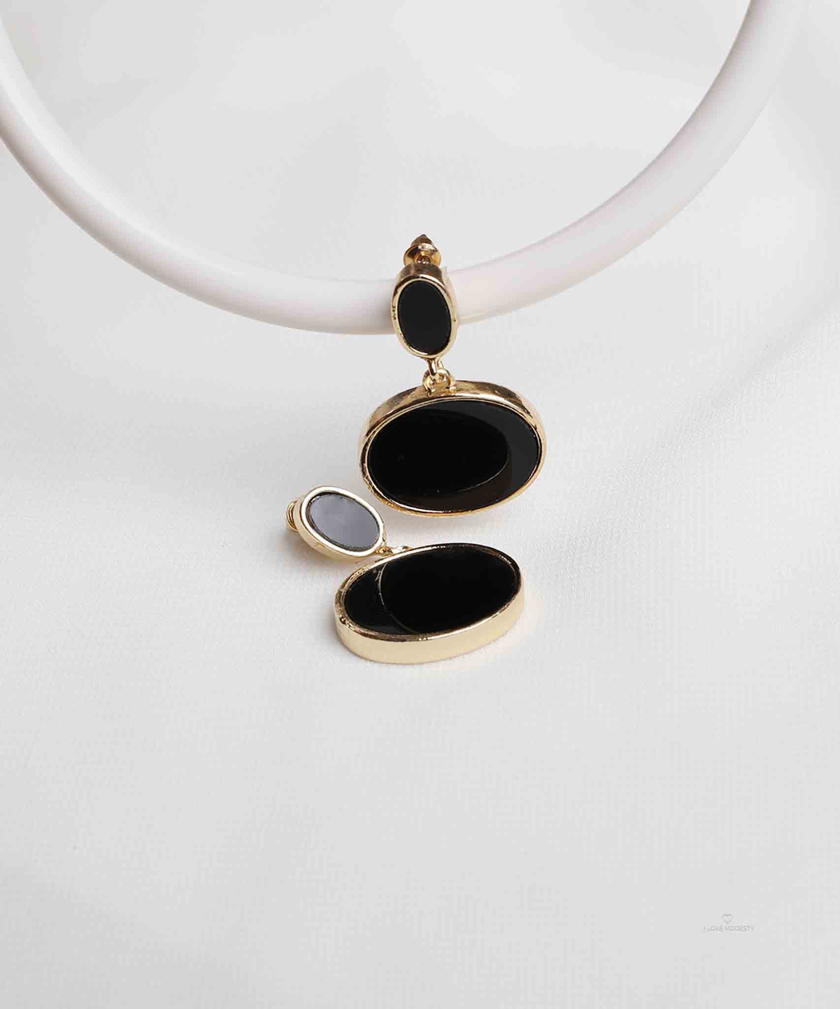 These Gold With Black Disc Drop Earrings feature smooth, black enamel discs set in sleek circular frames. The double-disc design adds soft movement and layered elegance, making them the perfect statement piece for both everyday polish and elevated occasions.