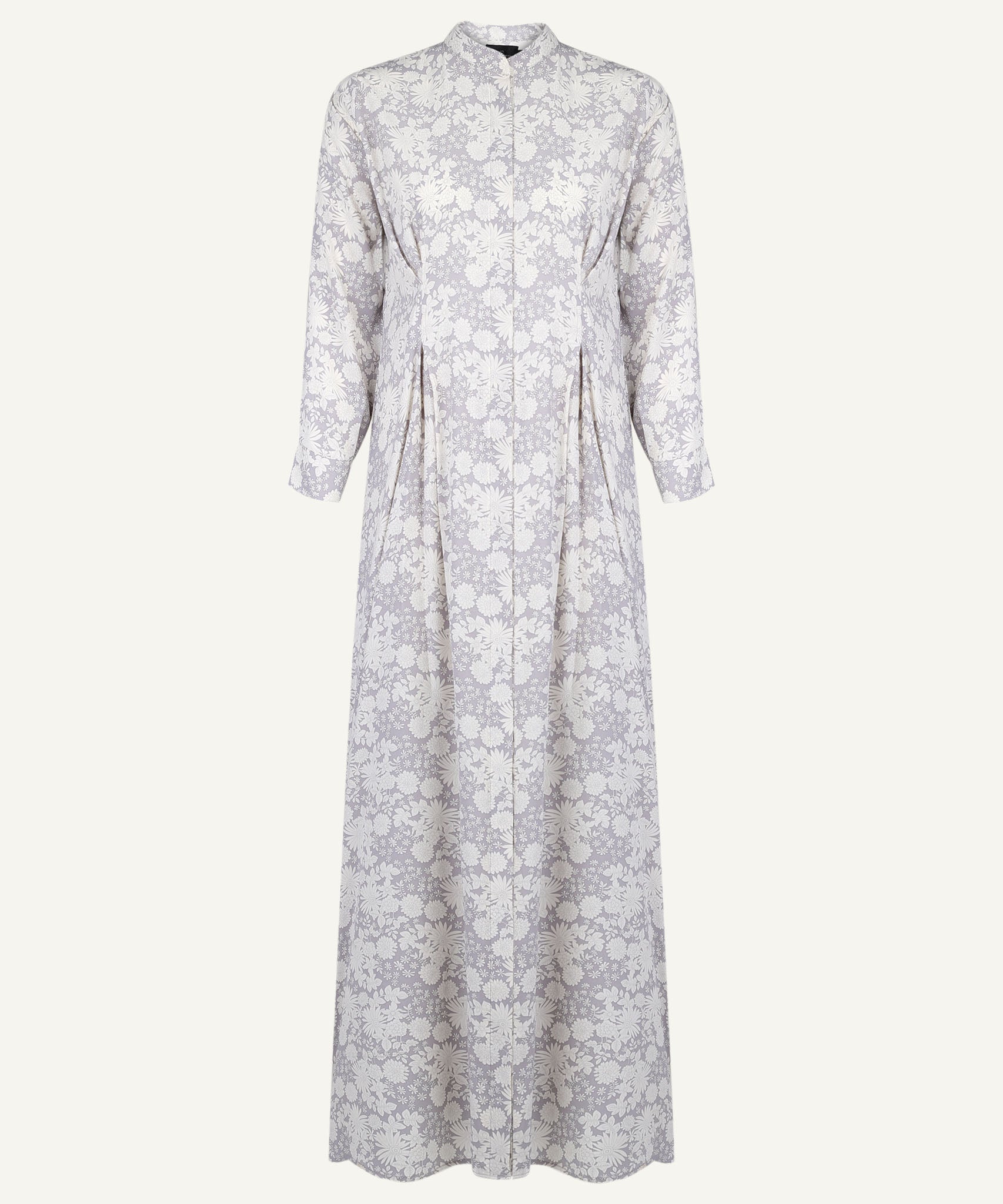 This Grey Floral Box Pleated Dress is crafted from lightweight georgette fabric in an A-line silhouette, featuring a hidden button placket and box pleat detailing at the front waist. Perfect for casual outings or daytime meetups in mild to warm weather.