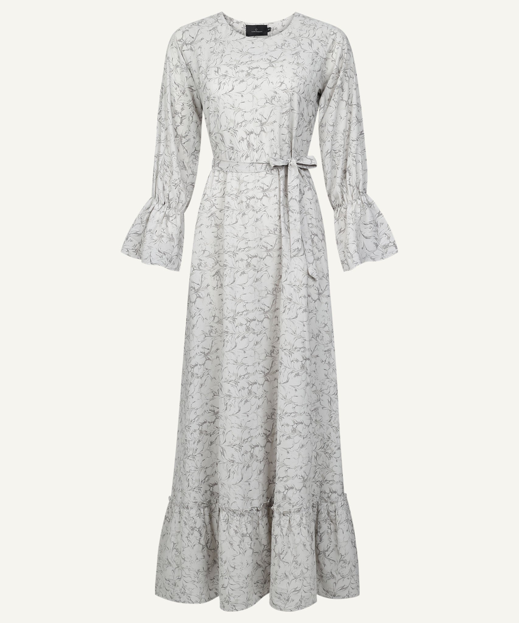 This Grey Printed Bell Sleeve Maxi Dress is crafted from lightweight georgette fabric. Features a flowy A-line silhouette and bell sleeves gathered at the cuffs with elastic detailing. A soft frill at the hem adds a feminine finish, making it perfect for both day and evening wear.