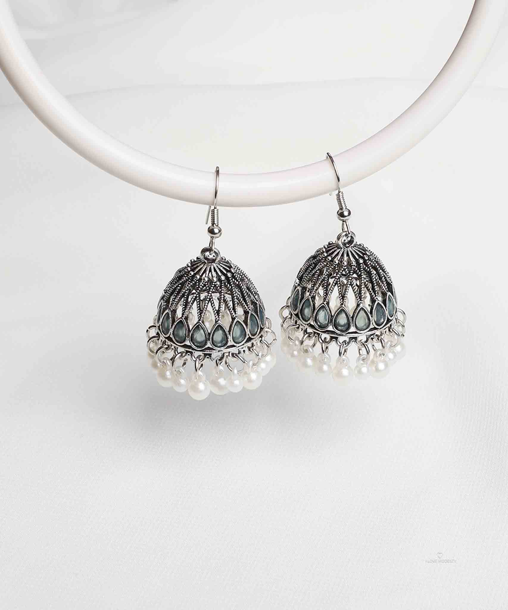 These Grey Stone Silver Jhumka Earrings blend tradition with minimalism. Featuring intricate detailing on a dome and delicate pearls, they complement both traditional and modern outfits perfect for weddings, festive occasions, or adding subtle elegance to everyday looks.