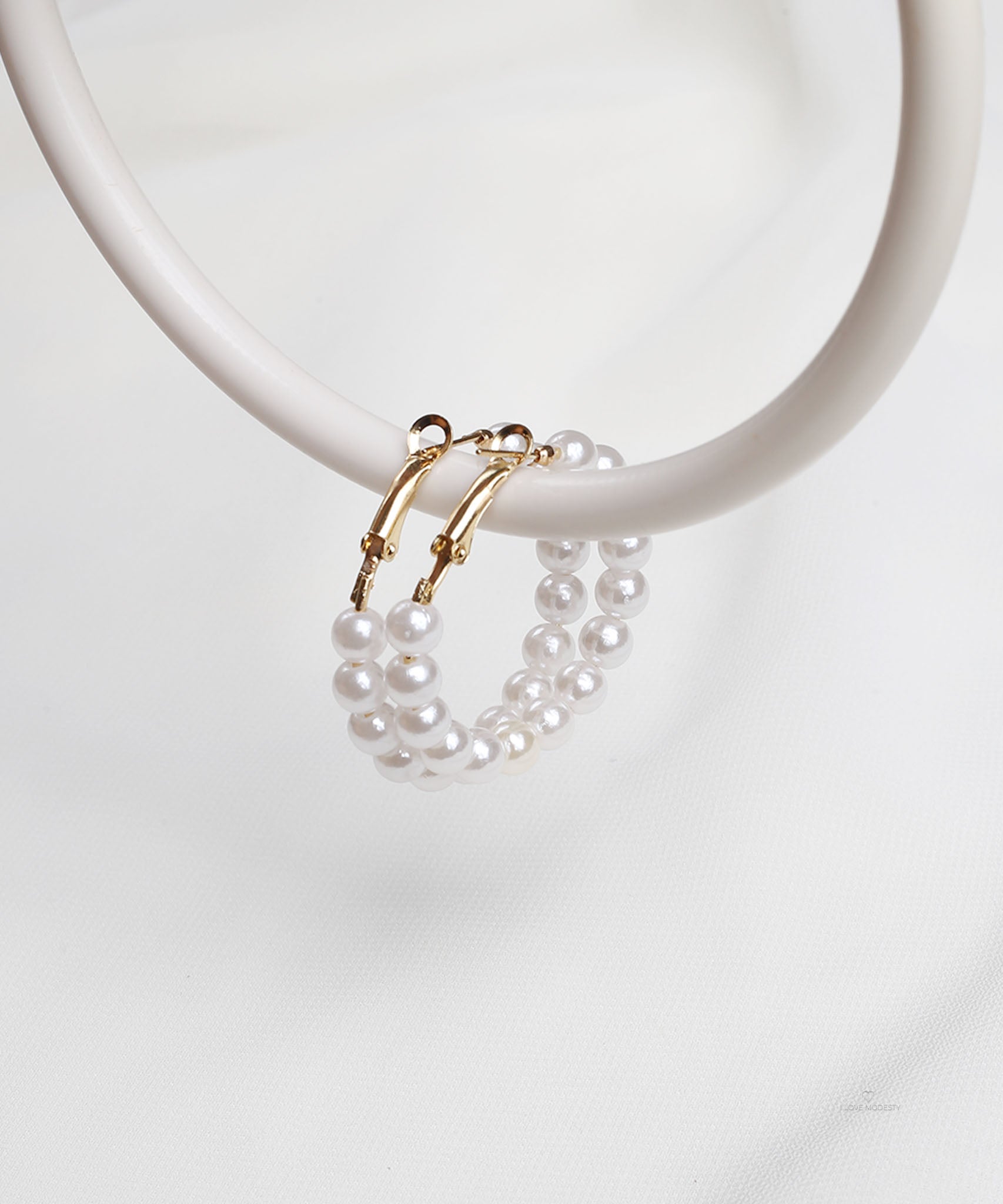 These Ivory White Classic Pearl Hoop Earrings feature a delicate row of lustrous pearls strung along a golden hoop base. Their lightweight structure and glossy finish make them a perfect match for everyday refinement or special occasions.