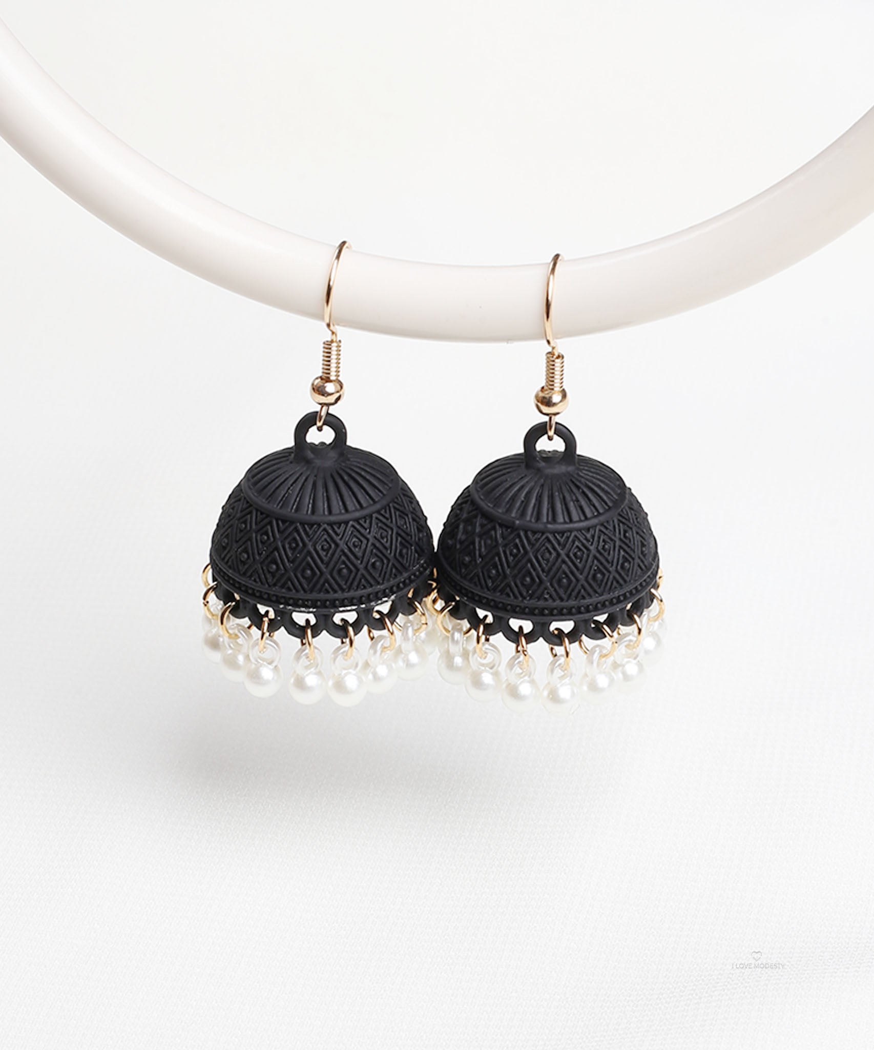 These Matte Black Pearl Dome Jhumka Earrings blend tradition with minimalism. Featuring intricate detailing on a matte dome and delicate pearls, they complement both traditional and modern outfits perfect for weddings, festive occasions, or adding subtle elegance to everyday looks.