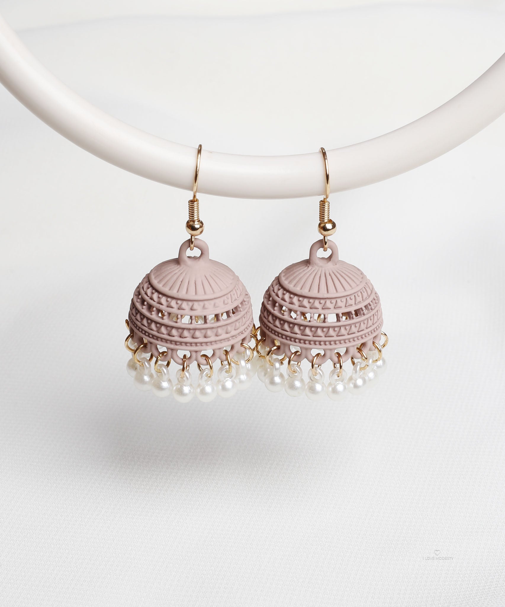 These Matte Dusty Rose Pink Pearl Dome Jhumka Earrings blend tradition with minimalism. Featuring intricate detailing on a matte dome and delicate pearls. The matte dusty rose pink hue complements both traditional and modern outfits perfect for weddings, festive occasions, or adding subtle elegance to everyday looks.