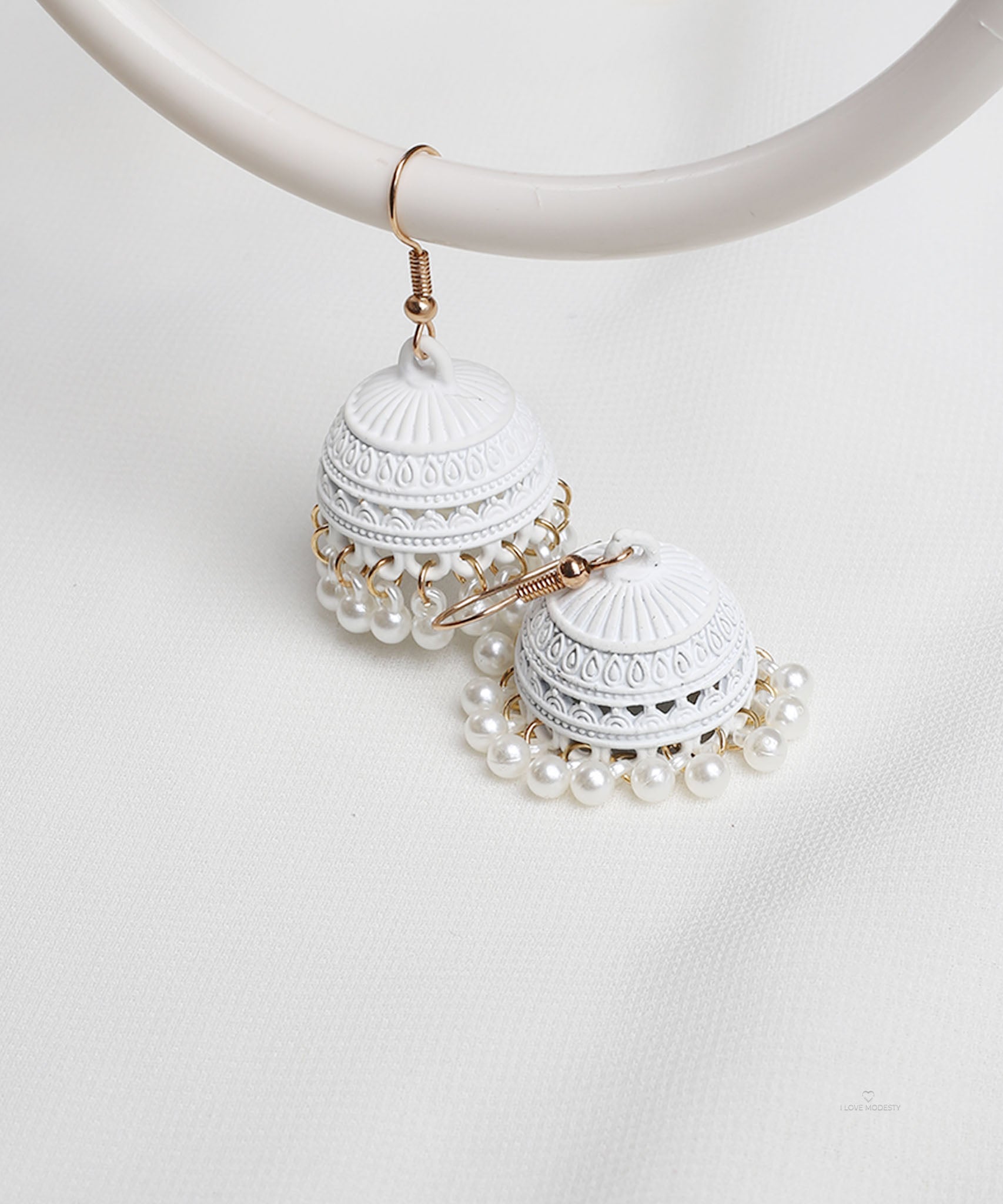 These Matte White Dome Jhumka Earrings blend tradition with minimalism. Featuring intricate detailing on a matte dome and delicate pearls, they complement both traditional and modern outfits perfect for weddings, festive occasions, or adding subtle elegance to everyday looks.
