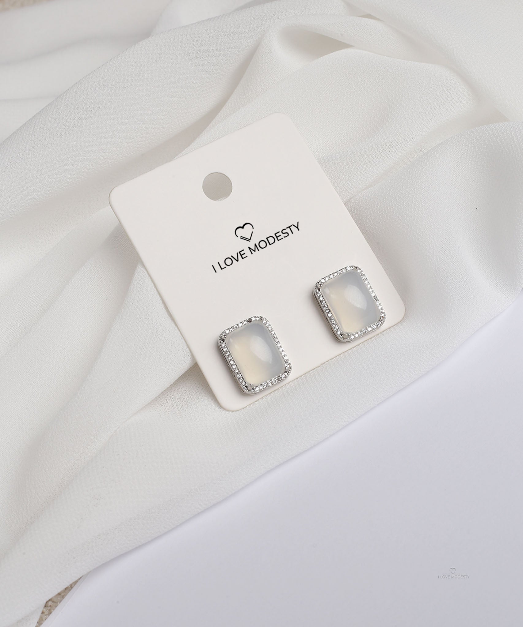 These Milky White Rectangle Stud Earrings feature a milky white quartz stone in a silver-plated frame encrusted with clear pave crystals. Perfect for everyday wear or adding a touch of charm to formal looks.