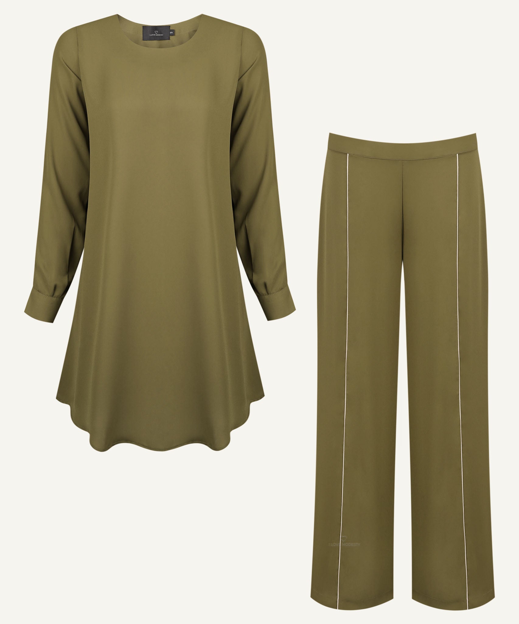 This Olive Contrast Piping Matching Set is crafted from lightweight georgette with a round-cut tunic and straight trousers, featuring subtle piping along the sleeves and trousers seams. Suitable for casual wear and daytime gatherings in mild to warm weather.