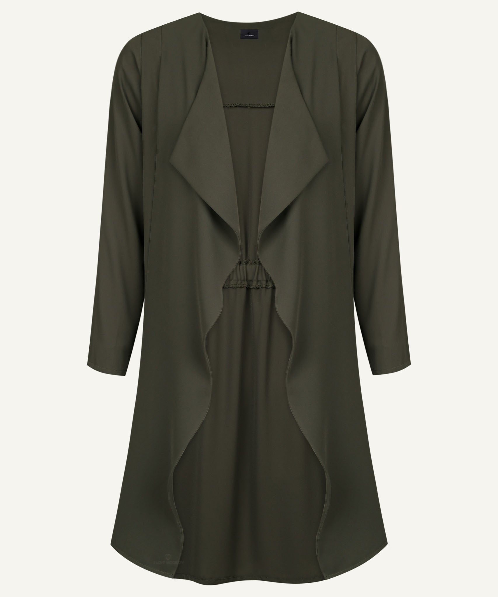 This Olive Green Draped Long Sleeve Cardigan is crafted from soft, flowy georgette. It features a front-open style and a shaped waistline for a flattering silhouette, making it perfect for layering and everyday wear.