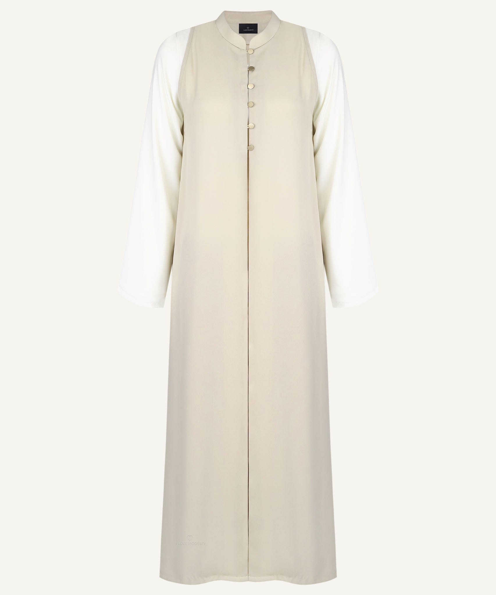 The Oyster Halter Midi-Length Matching Set is crafted from georgette-chiffon fabric. It includes a sleeveless open-front cardigan with a halter neck, paired with a mini-length lining featuring long sleeves in a soft beige contrast tone. The set includes elastic waist trousers for a comfortable fit.