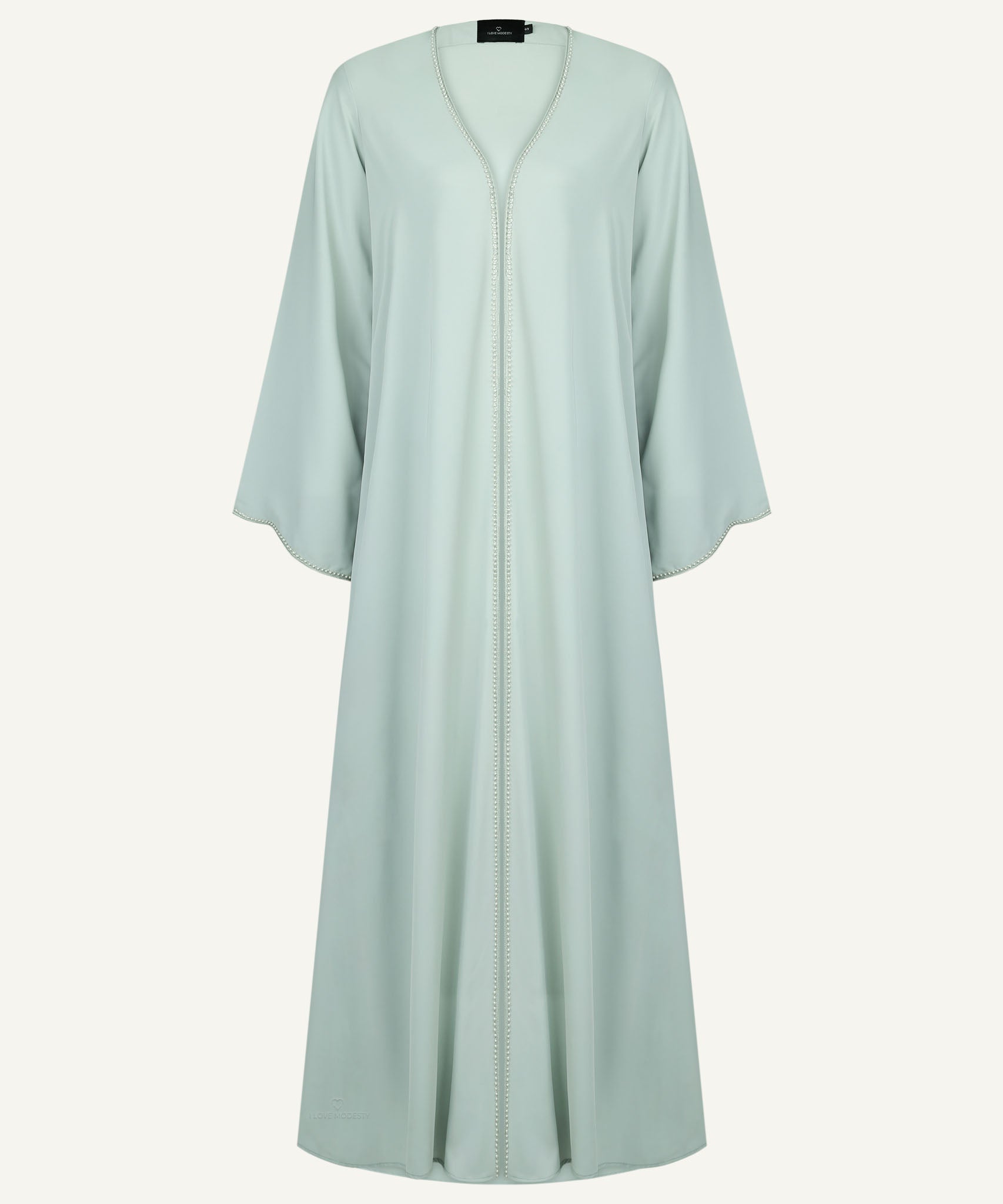 This Pastel Green Pearl Cardigan Abaya is crafted from soft georgette in a front-open style, adorned with handcrafted pearls. A refined pick for festive events and formal gatherings.